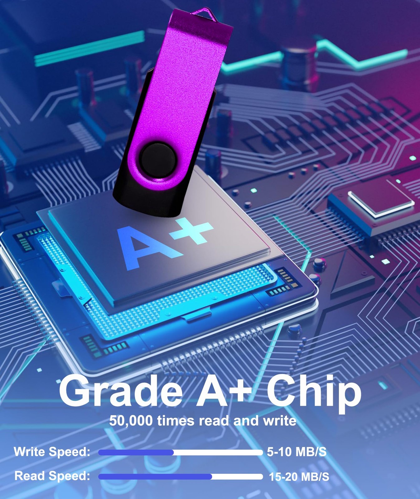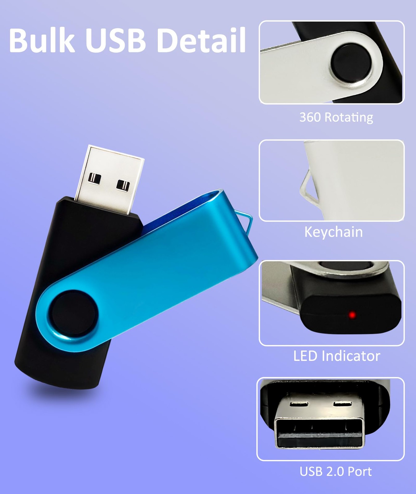 2GB USB 2.0 Flash Drive Bulk 50 Pack Thumb Drive Colorful Swivel Zip Drive USB Jump Drive Memory Stick Pendrive, Bulk USB Storage Flash Drive Ideal for Events & Office Shared Data Storage GRAET VALUE: This 2GB USB flash drives 50 pack offers great cost performance and high quality storage and quickly transfer files, photos, music, presentations - between friends and clients in the busy offices, education, business, clubs, government organizations, media industry, engineering, various events NO CAP DESIGN: If you're worried about losing your cap the 360°swivel loop closure design is the best choice, the 2GB USB thumb drive 50 pack comes built-in a hook, LED indicator and high speed USB 2.0. Flash drive 2GB easy to attach to pockets, keychains, backpacks and other items for easy carrying and store PLUG AND PLAY: These 2GB USB jump drive multipack no need to install any software. Just plug into the USB port of your computer, notebook, TV, printer, embroidery machine, car stereo, mini host, or other devices to use! These 2GB usb drive pack supports Windows 7/8/10/11/Vista/XP/2000/ME/NT, Linux, and Mac OS, compatible with USB 2.0 and below BEST GIFT: The 2GB USB flash drive pack of 50 ideal for business professional, student, photographer, and anyone needing reliable storage. Usb drive bulk 2GB for Promotional Giveaways, Direct Mail Campaigns, Tenders, Projects, Back to Schools, Exhibition, Christmas, Halloween, Independence Day, Children's Day, Teacher's Day, Corporate Gifts and Wedding Gift are best choice WHAT YOU GET: The usb stick 2GB includes 50PCS colorful USB memory stick 2GB and 50PCS colorful free lanyards -- Good after-sales service, if you have any questions in use please feel free to contact us, we will reply within 24 hours!