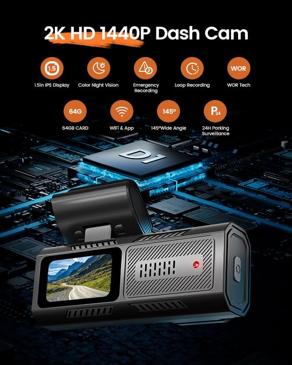 【1440P Front Car Camera with Screen】2K Mini Dash Camera, Night Vision, USB-C, G-Sensor, Cyclic Recording, 24 Hour Parking Mode, Free 64G SD Card, Maximum Support 256GB (USB cable to connect Mobile phone can't be used) 【Compact & Easy to Install】Mini dashcam compact design (Size: 3.5x1.6x1.4in), hidden car camera is mounted behind the rear view mirror and goes virtually unnoticed, which won't obstruct your vision while driving. Simple installation and operation, no need to worry even for a first time user. 【Smooth WIFI & APP Control Dashcam】 Use APP convenient to preview, download videos, change setting,. Fast to download and share videos with friends and family anytime anywhere. The wifi dash camera for cars, truck, SUV, easier to provide evidence when insurance claim. 【G-Sensor & Emergency Recording Car Recorder】 will save the emergency video to prevent it from being overwritten. When the storage capacity on the memory card reaches its limit, new videos will automatically overwrite the oldest ones. 【Seamless recording with FREE 64G Card】 dash cam with the latest real-time storage code stream technology, the storage speed is faster,Share and view files anytime, anywhere.