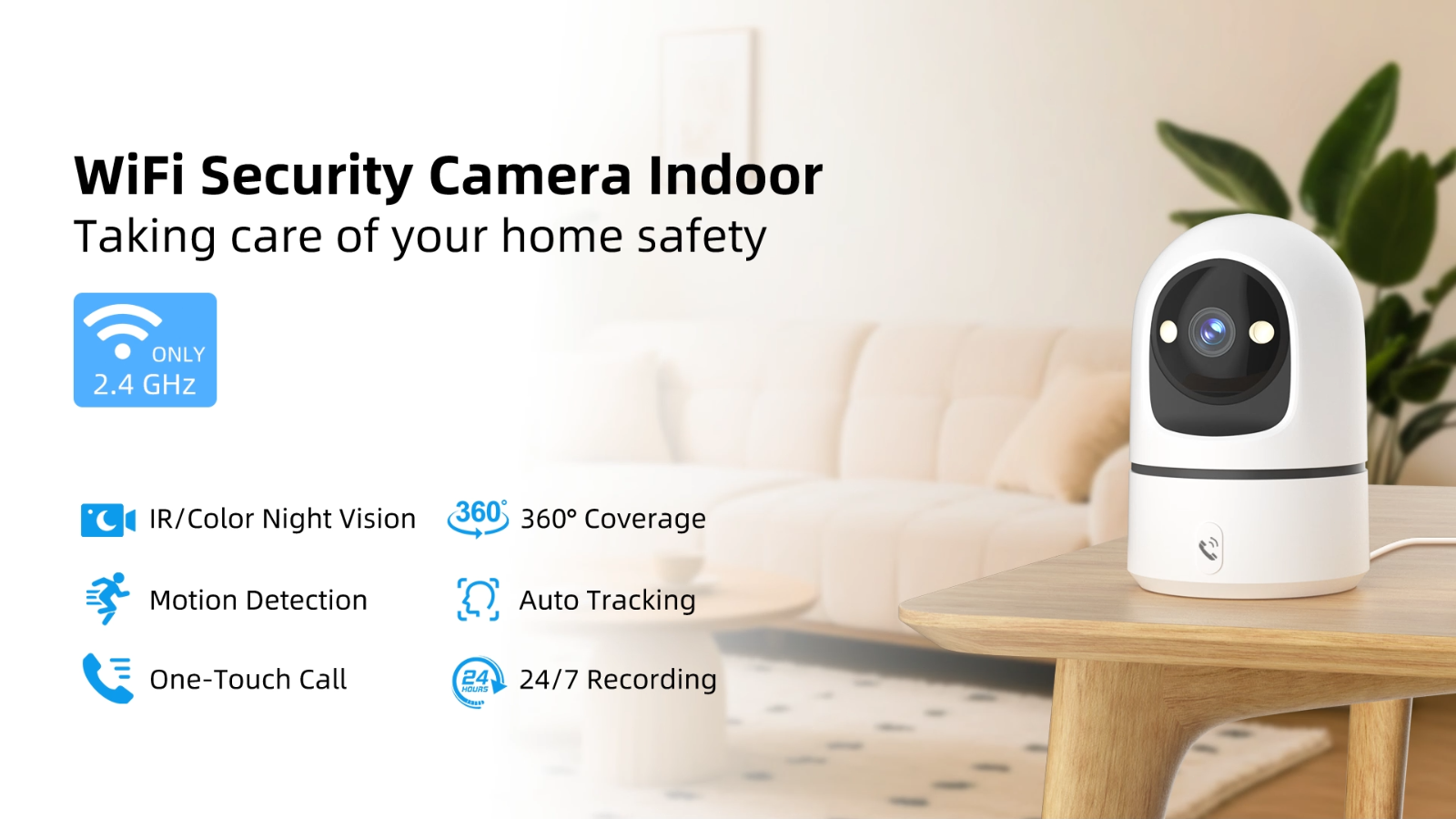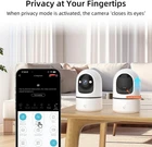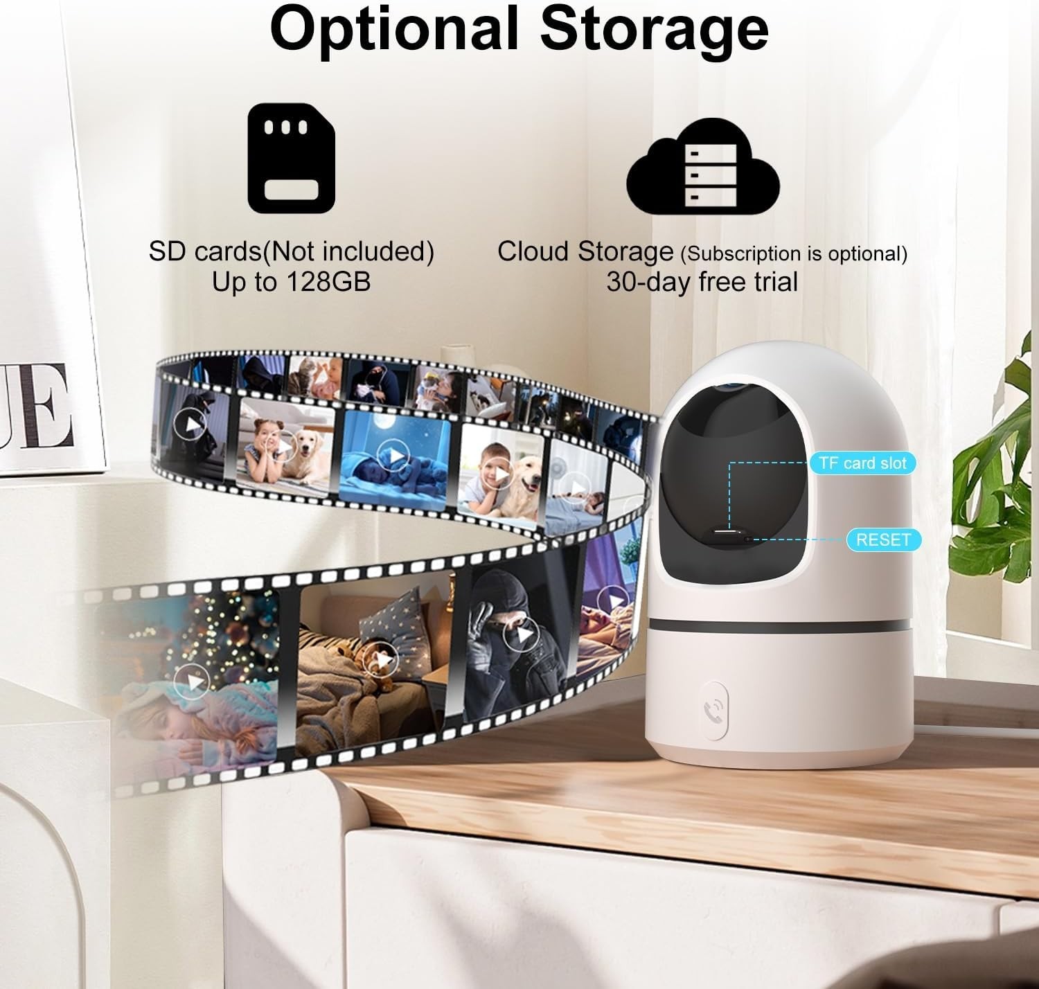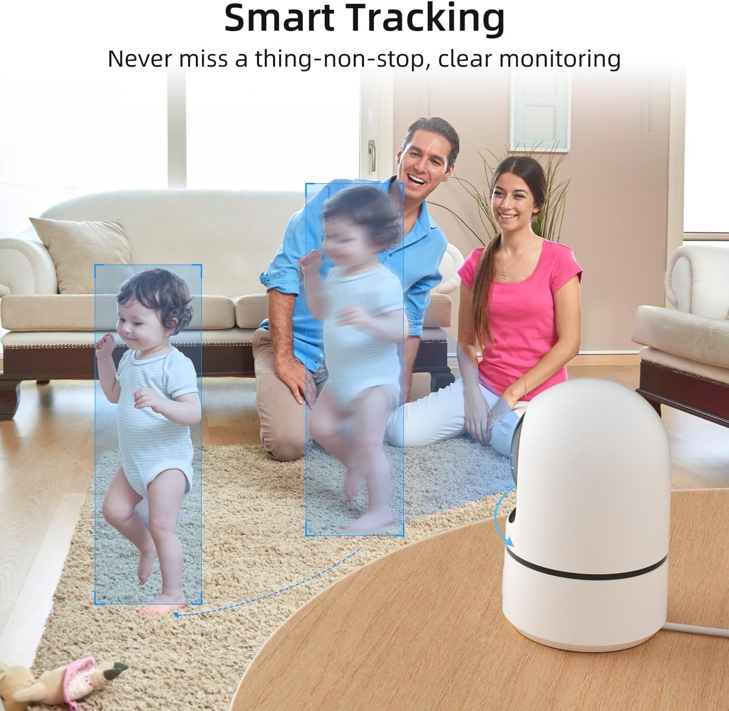 2K Indoor Security Camera, 360° WiFi Cameras for Home Security, Baby/Pet Camera with Phone App, One-Touch Call, Auto Tracking, IR Night Vision, Motion Detection, 2.4Ghz WiFi (1/2 Pack) 2K 3MP Resolution: Our pet camera indoor with phone app captures sharp details, from the text on children'sleeping to your pet’s playful movements. When night falls, color night vision kicks in, so you’ll see true hues of your room, kitchen, or living room. Whether it’s day or night, you’ll never miss a thing. (2.4GHz WiFi only, 5GHz WiFi not supported.) One-Tap Talk for Instant Connection: Skip the complicated steps—one tap on your phone is all it takes to chat with your family or calm your anxious pet. The two-way audio sounds crisp, no static or delays, so you can have real conversations, whether you’re reminding your teen to take out the trash or saying hi to your dog while at the grocery store. Motion Detection & Auto-Tracking: Get instant alerts on your phone when the home security camera spots movement—whether it’s a squirrel in the yard, or your toddler wandering. And the camera for home security doesn’t just alert you: it auto-tracks the movement, panning and tilting. Keeps the lens focused on the source of motion, providing a seamless, hands-free monitoring experience right from your phone. Optional Storage & 24/7 Recording: This pet camera with speaker supports both TF card (up to 128GB, not included) or cloud storage(subscription is optional). Never worry about running out of space. Record and store important footage effortlessly, whether it’s precious moments of your pets or security-related events. Please rest assured that your recording is safe and accessible at any time. Privacy Mode to Guard Your Space: Flip on the indoor security camera's privacy mode with one tap, and it shuts off video and audio recording completely. Whether you’re changing clothes or having a private conversation, you can relax knowing your space is just for you. No more worrying about unwanted recordings—just peace of mind.