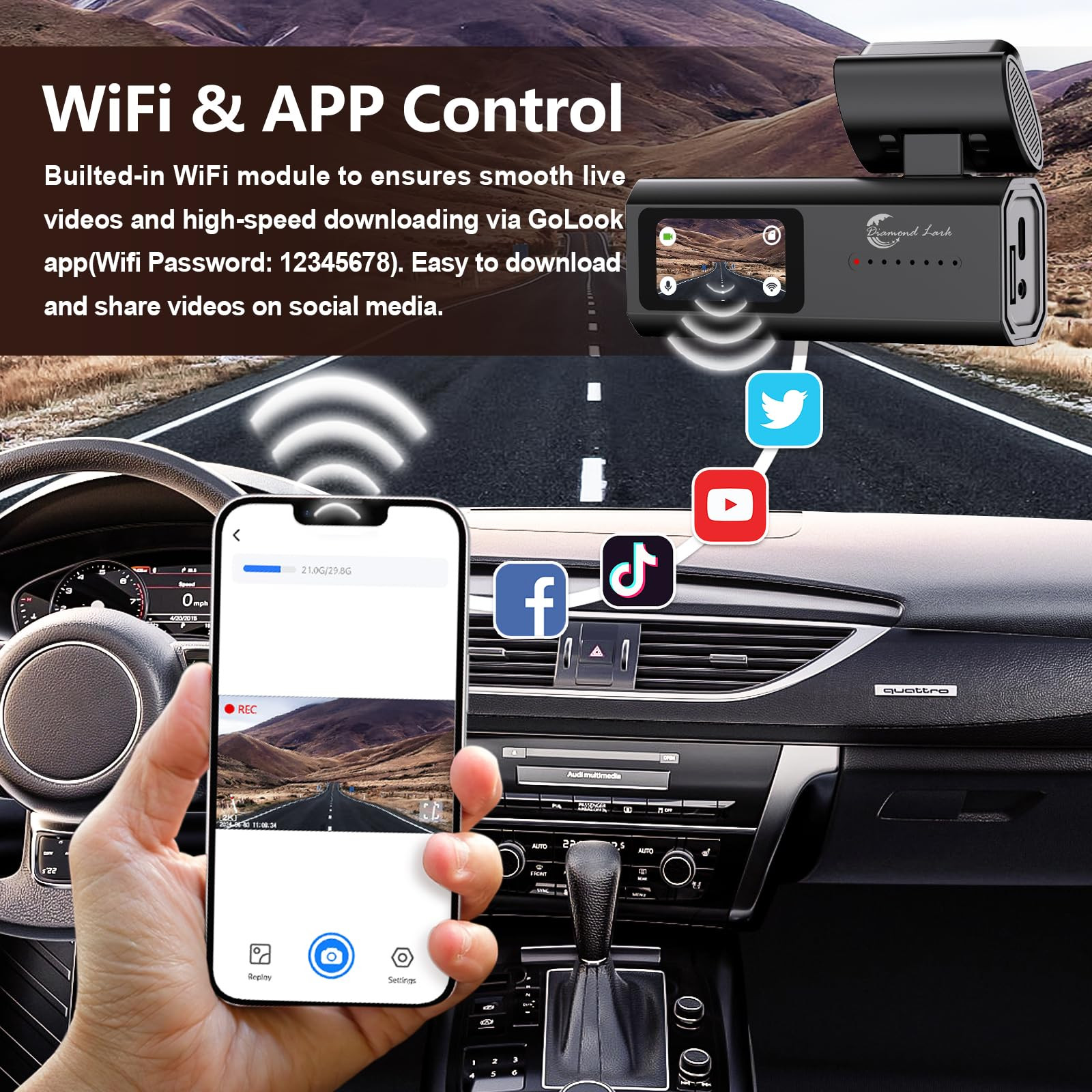 【2K Single Front Dash Cam】dash cam is equipped with a 170 ° wide-angle lens, which can reduce visual blind spots. In addition, the car dash camera records 1440p videos. It can clearly capture vehicle license plates, road signs, etc. which helps you retain and present evidence in unexpected situations such as collisions.It is a must-have item for everyone while driving 【1.47" LCD Screen & Built-in WiFi】This car dashcam not only comes with 1.47" LCD Screen, but also allows your smartphone to connect to the dashcam via a free GoLook App(downloaded from Google Store or Apple Store), enabling you to view, download recorded videos at any time. You can also upload them to social media platforms such as YouTube, Twitter, Facebook, and share your driving journey with your family and friends 【32GB Card Included & Loop Recording & G-sensor】When the 32GB memory card is full, the old video in the dash camera will be constantly overwritten by new video to ensure uninterrupted video recording. In addition, the dash camera for cars built-in G-sensor function. It can detect sudden crashes and automatically lock the video being shot to ensure that the video evidence will not be overwritten 【Parking Monitor & Detachable Bracket】When the vehicle is parked and turned off, the dash cam will continue recording video (with 4 recording duration options: 15min/12H/24H/48H) and will auto lock the current recorded video when a collision is detected. (Note: Need a hardwire kit to power the dashboard camera. ASIN: B0C9M8R4WL). Also, the car camera designed with a detachable bracket. Easy to use and install 【Car Charger with Cigarette Lighter】This dash cam is powered through the cigarette lighter. If your vehicle does not have a cigarette lighter socket, you will need to use an alternative power source (such as a hard-wired kit or USB power cable), and these accessories need to be purchased separately. In addition, the length of the car charging cable is 11.5FT
