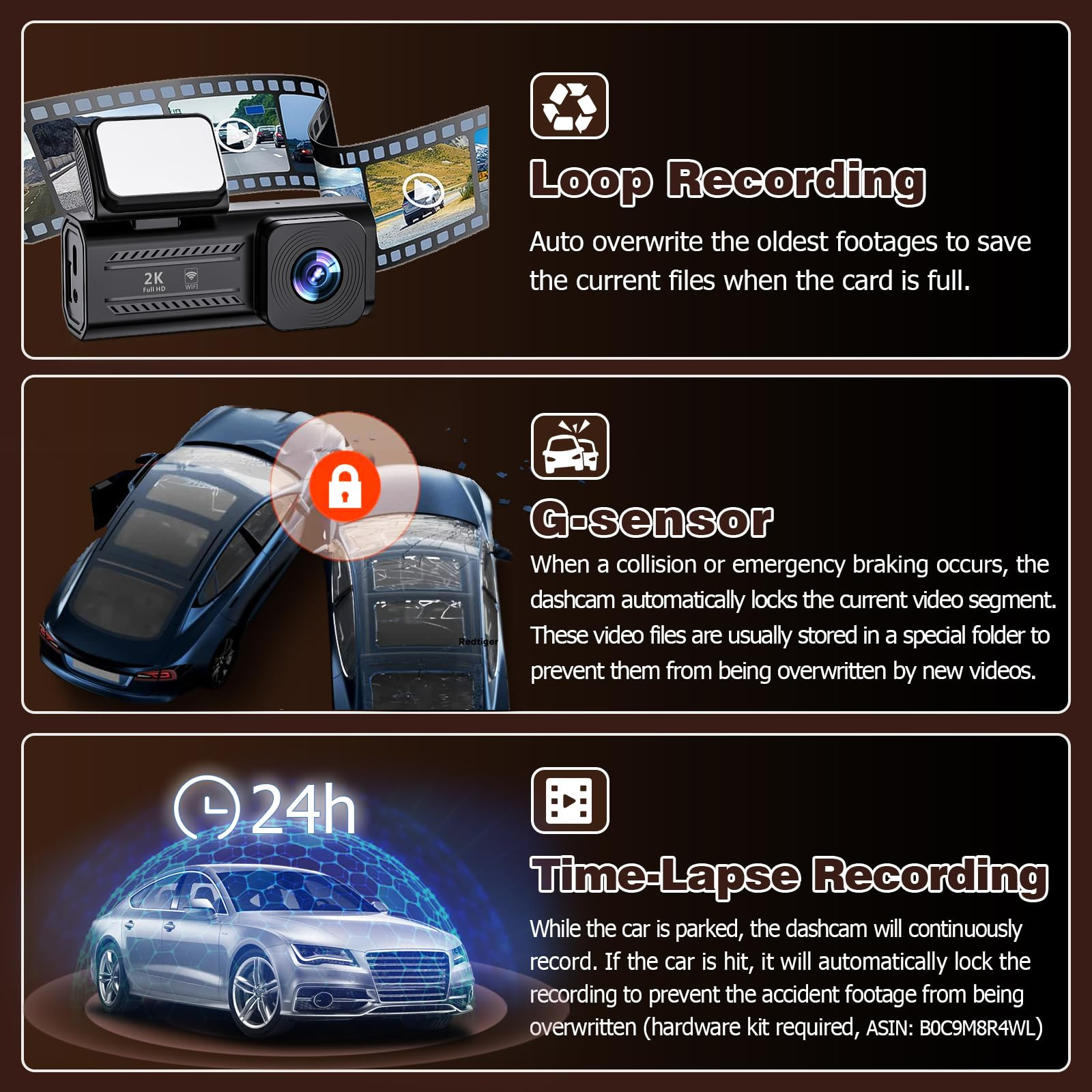 【2K Single Front Dash Cam】dash cam is equipped with a 170 ° wide-angle lens, which can reduce visual blind spots. In addition, the car dash camera records 1440p videos. It can clearly capture vehicle license plates, road signs, etc. which helps you retain and present evidence in unexpected situations such as collisions.It is a must-have item for everyone while driving 【1.47" LCD Screen & Built-in WiFi】This car dashcam not only comes with 1.47" LCD Screen, but also allows your smartphone to connect to the dashcam via a free GoLook App(downloaded from Google Store or Apple Store), enabling you to view, download recorded videos at any time. You can also upload them to social media platforms such as YouTube, Twitter, Facebook, and share your driving journey with your family and friends 【32GB Card Included & Loop Recording & G-sensor】When the 32GB memory card is full, the old video in the dash camera will be constantly overwritten by new video to ensure uninterrupted video recording. In addition, the dash camera for cars built-in G-sensor function. It can detect sudden crashes and automatically lock the video being shot to ensure that the video evidence will not be overwritten 【Parking Monitor & Detachable Bracket】When the vehicle is parked and turned off, the dash cam will continue recording video (with 4 recording duration options: 15min/12H/24H/48H) and will auto lock the current recorded video when a collision is detected. (Note: Need a hardwire kit to power the dashboard camera. ASIN: B0C9M8R4WL). Also, the car camera designed with a detachable bracket. Easy to use and install 【Car Charger with Cigarette Lighter】This dash cam is powered through the cigarette lighter. If your vehicle does not have a cigarette lighter socket, you will need to use an alternative power source (such as a hard-wired kit or USB power cable), and these accessories need to be purchased separately. In addition, the length of the car charging cable is 11.5FT