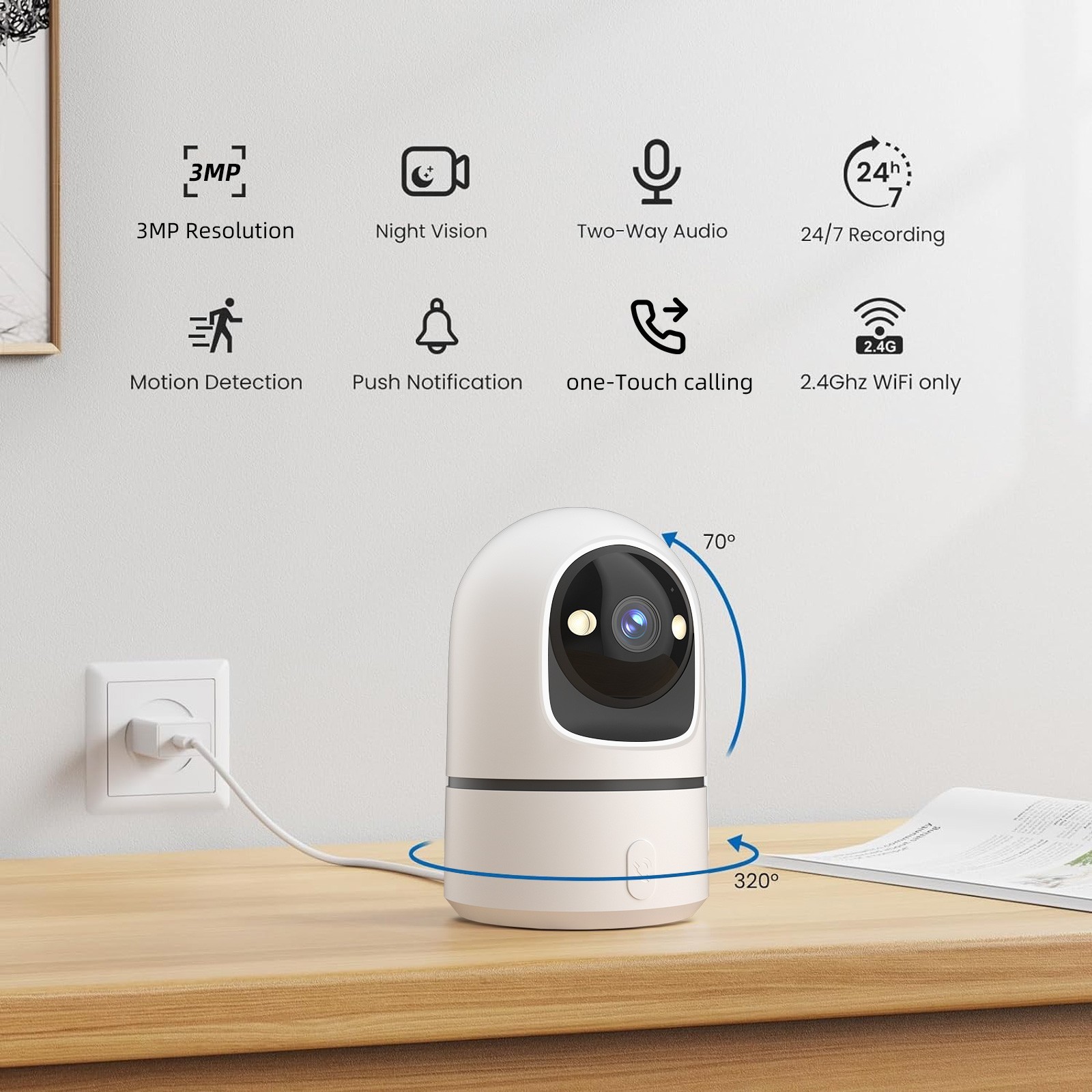 2K Indoor Security Camera, 360° WiFi Cameras for Home Security, Baby/Pet Camera with Phone App, One-Touch Call, Auto Tracking, IR Night Vision, Motion Detection, 2.4Ghz WiFi (1 Pack) 2K 3MP Resolution: Our pet camera indoor with phone app captures sharp details, from the text on children'sleeping to your pet’s playful movements. When night falls, color night vision kicks in, so you’ll see true hues of your room, kitchen, or living room. Whether it’s day or night, you’ll never miss a thing. (2.4GHz WiFi only, 5GHz WiFi not supported.) One-Tap Talk for Instant Connection: Skip the complicated steps—one tap on your phone is all it takes to chat with your family or calm your anxious pet. The two-way audio sounds crisp, no static or delays, so you can have real conversations, whether you’re reminding your teen to take out the trash or saying hi to your dog while at the grocery store. Motion Detection & Auto-Tracking: Get instant alerts on your phone when the home security camera spots movement—whether it’s a squirrel in the yard, or your toddler wandering. And the camera for home security doesn’t just alert you: it auto-tracks the movement, panning and tilting. Keeps the lens focused on the source of motion, providing a seamless, hands-free monitoring experience right from your phone. Optional Storage & 24/7 Recording: This pet camera with speaker supports both TF card (up to 128GB, not included) or cloud storage(subscription is optional). Never worry about running out of space. Record and store important footage effortlessly, whether it’s precious moments of your pets or security-related events. Please rest assured that your recording is safe and accessible at any time. Privacy Mode to Guard Your Space: Flip on the indoor security camera's privacy mode with one tap, and it shuts off video and audio recording completely. Whether you’re changing clothes or having a private conversation, you can relax knowing your space is just for you. No more worrying about unwanted recordings—just peace of mind.