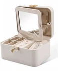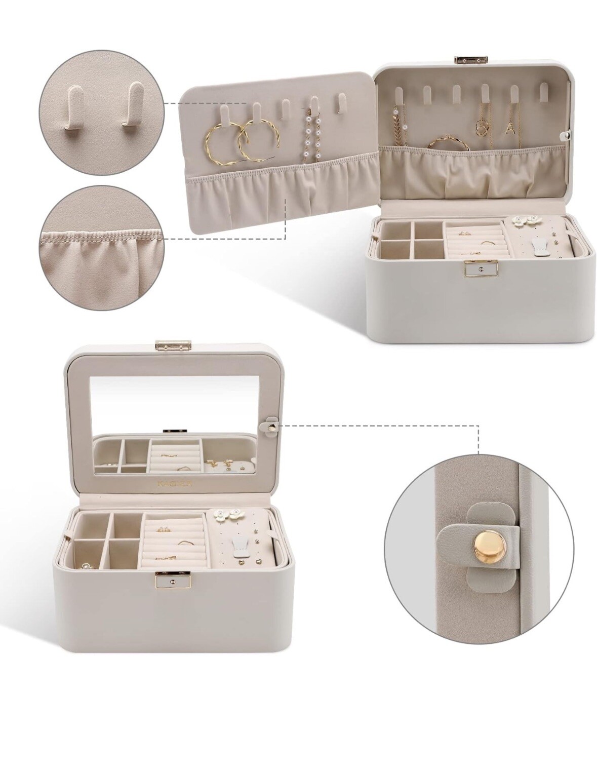 New open box missing key KAMIER Jewelry Box, 2 Layers PU Leather Jewelry Organizer Box, Large Capacity, Double Lock and Large Mirror, Hidden Necklace Hooks, Removable Dividers, Gift Box Packaging, Grey Leather + Velvet lining Kamier Jewelry Boxes & Organizers Hidden Design: A large mirror is built into the lid, there are 10 necklace hooks and two elastic pleated pockets inside the mirror to fix the necklaces in place. Double Layer & Large Storage Space: In the first layer, there are 1 earrings plate, 2 extra removable spaces and 8 rings holders, In the second layer, there is a removable space to store watches or something larger keepsakes.