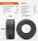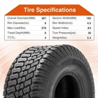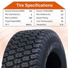 Tread Pattern 1 ( Package Included: 2 Tires) 15x6.00-6 Tire Specification: Pattern Model: P328 Ply Rating: 4PR/TL Section Width: 6'' Rim Width: 4.5 IN Overall Diameter: 15'' Tread Depth: 0.5'' Tire Aspect Ratio(%): 75 Max PSI: 30 Max Load: 565lbs Weight: 5.84lbs / 2.65kg Tread Pattern 2 ( Package Included: 2 Tires) 15x6.00x6 Tire Specification: TT/TL: TL Tire Type: Lawn & Garden Tire Speed Rating: A3 Tire Load Range: B Section Width(mm): 6'' Rim Width(in): 4.5 Overall Diameter(mm): 15'' Tread Depth(mm): 0.18'' Max PSI: 30 Load Index(lbs): 570 Tread Pattern 3 ( Package Included: 2 Tires) 15x6.00-6 Tire Specification: TT/TL: TL Tire Load Range: B Ply Rating: 4PR Section Width: 6'' Rim Width: 4.5 IN Overall Diameter(mm): 15'' Tread Depth: 0.24'' Load Index: 61 Max Load: 570lbs Weight: 5.4lbs / 2.45kg Tread Pattern 4 ( Package Included: 2 Tires) Tread Pattern 5 ( Package Included: 2 Tires)