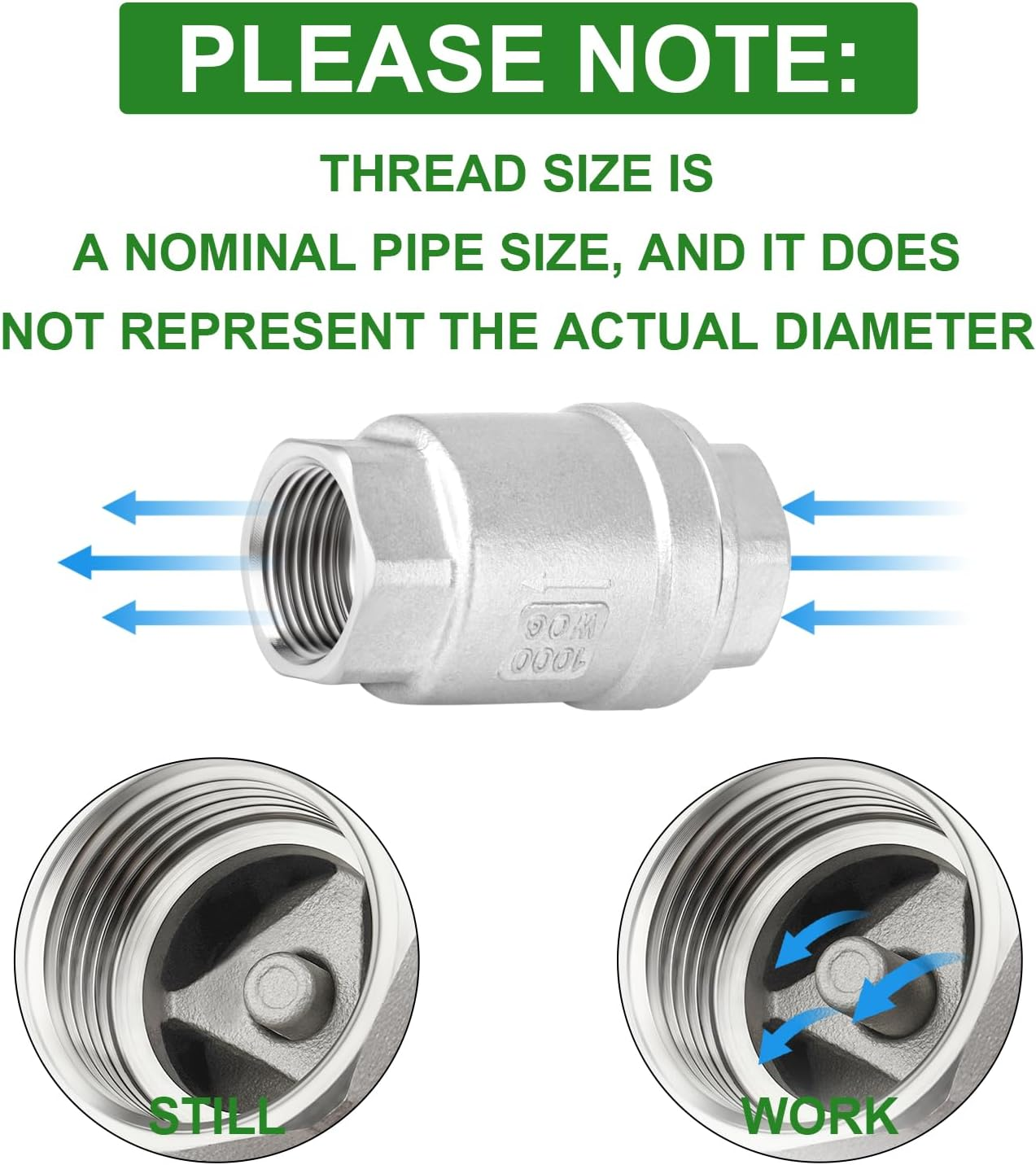 [ Product Type ] Vertical Check Valve(3/4" Female) ,for industry connecting pipes or fittings with different end types, diameters, or materials. [ Product Material ] 304 stainless steel strength and resistance to corrosion, ductility at high temperatures, and low magnetic permeability. [ Working Temperature& Maximum Pressure ] Temperature range from -60 to 450 degrees F.Maximum working pressure is 1000PSI. [ Introduction ] Used to prevent fluid backflow, good tightness, no leakage, easy to install and disassemble. [ Applications ] Widely used in fuel/air/liquid/oil/gas, pipeline applications and connections, and can be used in various measuring devices and collectors. Product Description Vertical Check Valve 304 Stainless Steel TAISHER 304 stainless steel Vertical Check Valve, Stainless steel precision cast valve body with reasonable structure and beautiful appearance, spring device used in pipeline system to prevent backflow of medium.Light weight, easy to install, can be installed in the horizontal and vertical direction of the pipeline, spool closing speed, water hammer pressure is small, good sealing performance. The video showcases the product in use. The video guides you through product setup. The video compares multiple products. The video shows the product being unpacked. 1 Merchant Video Teflon tape Good sealing, repairable valves are more convenient, WOG1000 is more suitable for high pressure and industrial Product Material The accessory is made of 304 stainless steel, which has low temperature resistance, high temperature ductility and low magnetic permeability. Product Details Used to prevent fluid backflow, good tightness, no leakage, easy to install and disassemble. Easy To Use Widely used in fuel/air/liquid/oil/gas, pipeline applications and connections, and can be used in various measuring devices and collectors. About This Product [Please note] When purchasing pipe fittings, consider the application, as this will affect material type, shape, size, and required durability. Fittings are available threaded or unthreaded, in many shapes, styles, sizes, and schedules (pipe wall thickness) 304 Stainless Steel Check Valve Add to Cart Add to Cart Add to Cart Add to Cart Add to Cart Customer Reviews 4.0 out of 5 stars 22 4.0 out of 5 stars 22 4.1 out of 5 stars 74 4.1 out of 5 stars 74 4.1 out of 5 stars 74 4.1 out of 5 stars 74 Price $14.99 $ 14 . 99 $16.99 $ 16 . 99 — $28.99 $ 28 . 99 $22.99 $ 22 . 99 $22.99 $ 22 . 99 Material 304 Stainless Steel 304 Stainless Steel 304 Stainless Steel 304 Stainless Steel 304 Stainless Steel 304 Stainless Steel Working Pressure 1000PSI 1000PSI 600PSI 600PSI 600PSI 600PSI Temperatures Range -60 to 450 degrees F -60 to 450 degrees F -60 to 450 degrees F -60 to 450 degrees F -60 to 450 degrees F -60 to 450 degrees F Include 1 2 1 1 1 1 Thread NPT NPT NPT NPT NPT NPT