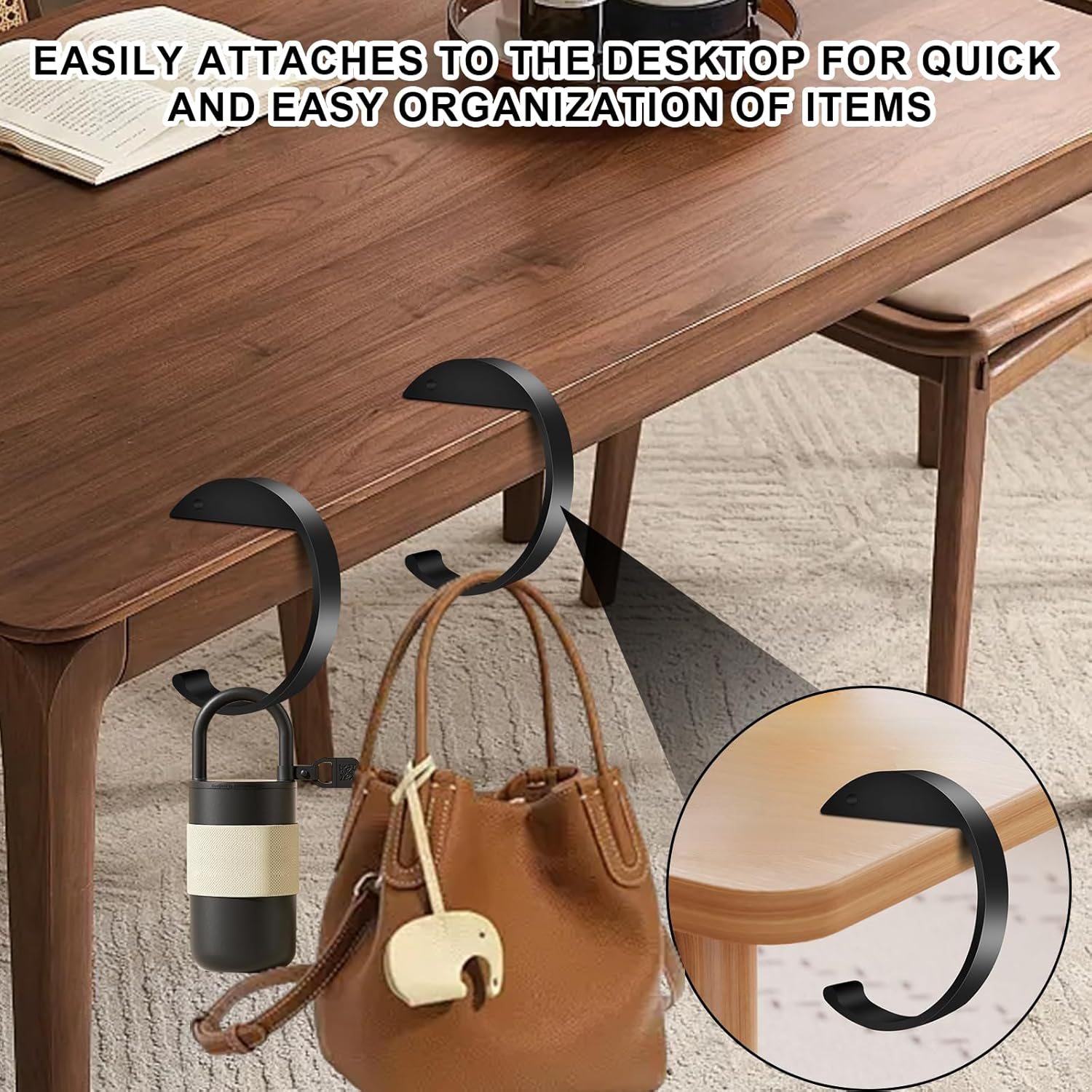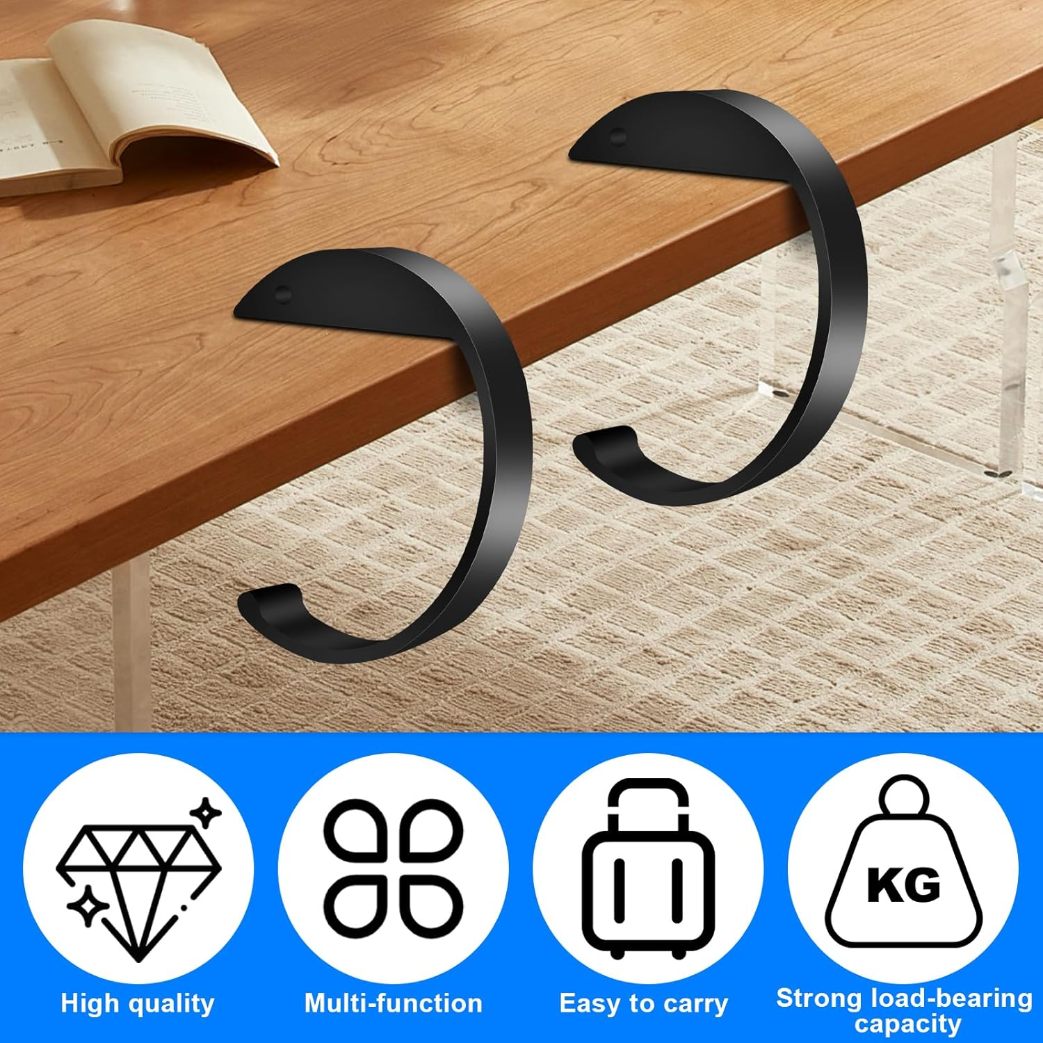 【High Quality Materials】: C Shape Purse Hook from high-strength aluminum alloy, these purse hooks are durable and sturdy, capable of securely holding your bag or purse without bending or breaking. 【Portable Design】: Keep your purse hook for table, or backpack organized with this foldable purse hook. Easily attach it to any table, desk, to save space and protect your items from the floor. 【Versatile & Multifunctional】: Purse hook for desk Not just for purses, these hooks are suitable for holding a variety of small items such as keys, umbrellas, headphones, or even lightweight coats, offering convenience and organization in any workspace. 【Elegant & Stylish】: With a sleek, modern design, this desk purse hook adds an elegant touch to your office or home decor.it’s the perfect addition to your office desk accessories. 【Perfect Gift】: A thoughtful and practical gift, this table hook is perfect for birthdays, holidays, or office events. Your friends, ladies will love this compact, portable solution for keeping their bags organized. Packing list: 2 pcs purse hook for table, 2 adhesive strips.