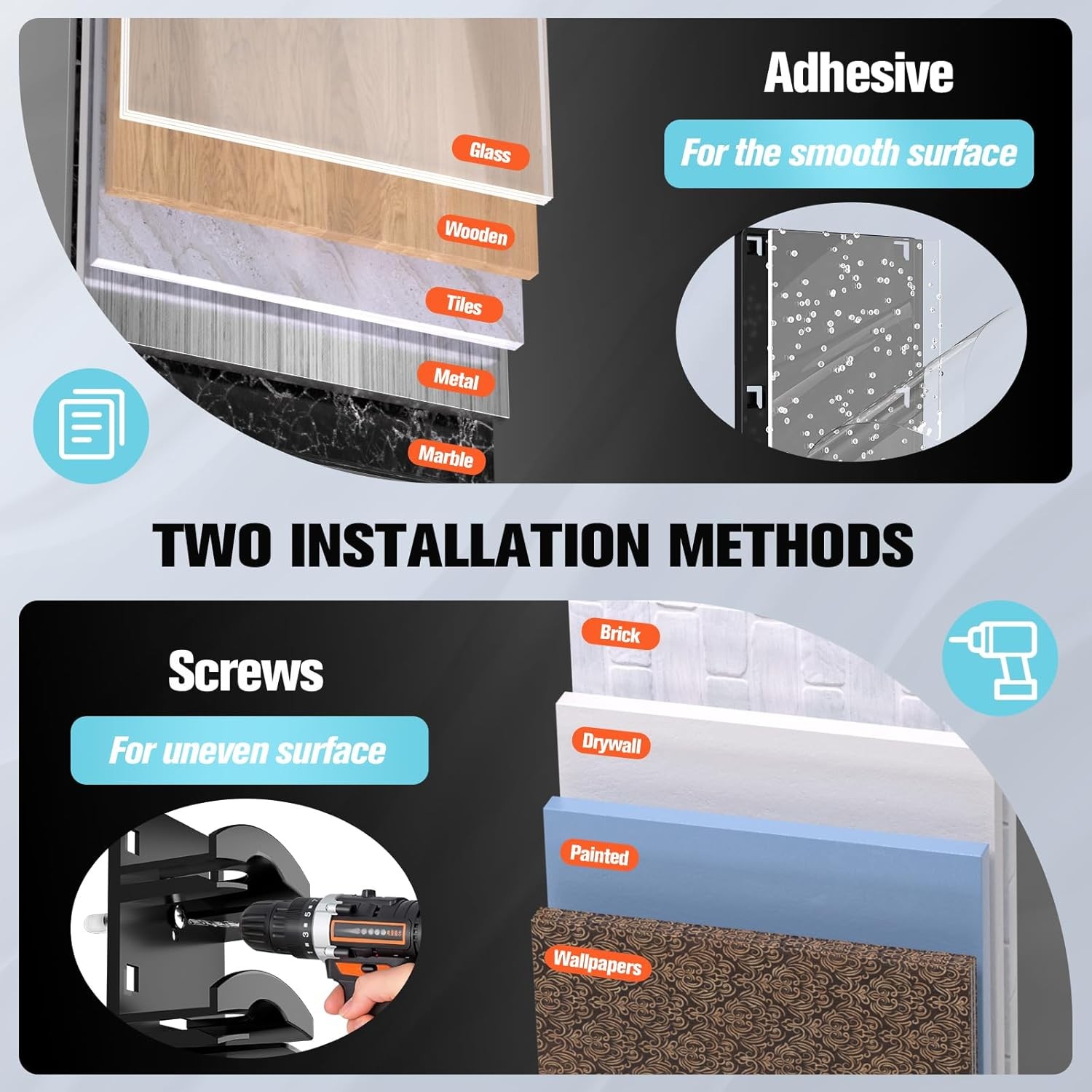 One hat, one layer: This hat storage box is designed to hold one hat, one layer at a time, for easy access. Unlike typical hat hooks on the market, this hat storage box's bottom layer is difficult to remove. No need to stack hats; even the bottom layer can be easily removed by gently lifting the brim. Two Display Options: The baseball storage box can be hung by the hat buttons or displayed front-facing for a look while keeping hats in top condition. It can also be hung vertically using the adjustable hat cord for quick and easy access. Two-Pack, Holds Up to 20 Hats: This two-pack of hat storage boxes offers a large capacity while taking up minimal space. Each box holds 10 hats and measures only 14 x 2.36 x 1.3 inches. It can be hung on the wall, behind a door, in a door frame, or in a wardrobe for both display and storage, creating a and practical solution. Two Mounting Options: This wall-mounted hat rack offers two mounting options: self-adhesive and screw-drill. Choose the appropriate mounting method based on your usage scenario. Note: Due to its strong adhesive properties, please ensure the orientation and placement of the wall panel is facing upwards before applying to avoid repeated tearing. Wide Applications: The self-adhesive baseball storage rack can be used on smooth surfaces such as wardrobes, doors, marble, tile, refrigerators, and more. If you need to install on rough surfaces, such as painted walls, concrete walls, and other uneven surfaces, please be sure to drill holes with screws. Our hat storage rack creates more storage space in limited space and is the best choice for storing baseball caps!