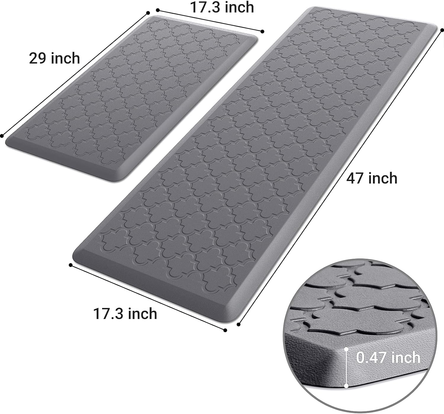 Kitchen Mat [2 PCS] Cushioned Anti-Fatigue Floor Mat, Waterproof Non-Skid Ergonomic Comfort Foam Rugs, Standing Mat for Kitchen, Floor,Office, Sink, Laundry(Grey) ANTI-FATIGUE: the anti fatigue kitchen mats are ergonomically engineered to provide greater comfort; for people who stand for long periods of time, to help posture and relieve back pain, and to ensure that you are able to stand comfortably while working PERFECT SIZE AND SAFE MATERIAL: the kitchen mat set contains 2 kitchen mats may be used separately or in combination to meet different needs; the kitchen rugs and mats made of premium PVC and thick foam, are built for long-lasting durability WATERPROOF AND EASY CARE: the kitchen floor mat are easily cleaned when water, stains, or oil splashes on the mat; wipe off the dirt with a damp cloth or hand-held vacuum as needed; This care routine saves time and ensures standing mat will last for years ANTI-SLIP: the kitchen rugs and mats is designed with a unique beveled edge; The top of the rugs for kitchen floor are designed with an embossed texture while the bottom is made of non-slip material so that the kitchen carpet does not move around VERSATILE: the standing pad provides extra large surface area for standing in laundry room, kitchen, office, farmhouse, or in front of sink or any other high-traffic indoor or outdoor space NOTE: open kitchen carpet fully place on even, flat, dry floor; Water under mat may result in slippage; mat must be placed on dry surface during use Product Description The charming color coordinates with any décor, and the thickness is perfect.Our standing desk mat can help relieve the discomfort caused by daily work in the kitchen or tasks that require long periods of standing. The ergonomic cushioned kitchen mat help to relieve pressure and provide superior comfortable support Four reasons to choose SoftDuo kitchen rugs: 1.Waterproof surface is easy to clean. 2.Thickened foam provides cushion support. 3.The non-slip bottom has a slightly raised texture o prevent slipping. 4.The unique beveled edge design to prevent tripping on th mat. kitchen cushioned floor mat laundry rug standing desk mat anti fatigue Item Thickness 0.47 Inches Material Type Free PVC Free, Phthalate Free, Latex Free Number of Items 2 Color Stylish Grey Pattern Solid Material Polyvinyl Chloride (PVC) Shape Rectangular Item Weight 5 pounds Batteries required No Size 17.3"x29"+17.3"x47" Special Feature Waterproof Product Dimensions 47"L x 17.3"W x 0.47"Th Product Care Instructions Hand Wash Only Number of pieces 2 Shipping Fast shipping is very important for us. Our standard US shipping service is FREE. Your order will be shipped within 2-3 business days upon full payment received. Your order will be delivered within 2-3 business days after the handling time. We only ship to the confirmed PayPal address. We reserve the right to cancel any order for any reason at any time. We are not responsible for undeliverable addresses. Returns and payment We offer a 30 days return policy from checkout winning date. We allow only PayPal as payment method FeedBack Your feedback very important to us, after you get your package and you are satisfied with our service please leave us positive feedback If you have any problem with your order / any questions please before leave any type of feedback For any questions, using eBay contact system Please visit our eBay store to check out other items for sale! Thank you for shopping at our store.