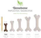 DURABLE, LONG-LASTING – Pint-sized super chewer? Bring it on. Benebones are tougher than real bones and last for weeks. REAL BACON AND REAL WOOD – We use only 100% REAL BACON for flavor and scent in our Zaggler, and real maple wood in the Maplestick. Trust us, little dogs can tell the difference. EASY TO PICK UP AND CHEW – Our Maplestick and Zaggler are uniquely shaped for a paw-friendly grip so your pup can quickly grab them and get a good chew going. Think about it: dogs don’t have thumbs. UNIQUELY FUN SHAPES - The Maplestick’s unique shape will surely upgrade your game of fetch. The Zaggler likes to roll around and is constantly on the move. Two fun shapes in one pack! USA Made – We make and source everything in the USA. The Benebone Tiny Maplestick/Zaggler Little dogs love to chew just like the big guys. And they dig real flavors like bacon and maple wood. About Benebone At Benebone, we started with the premise that dogs experience scent and flavor in a way we can’t even grasp. So we ditched the neon colors and loud squeaks. Inspired by a dog’s powerful sense of smell, we developed long-lasting durable chew that are jam-packed with real bacon and real maple wood. Once your tiny dog takes a bite of our USA-made chews, he’ll be hooked. We’re Obsessed with Safety Too Wonder if Benebone is right for your dog? Here’s what you need to know. Since it’s hard, it’s important that your pup has strong teeth. If you’re unsure, check with your vet. Nobody likes an unexpected trip to the dentist. Keep an eye out for wear and tear. Within a month or so, we find that most dogs chew Benebone into submission. See the wear page on our website for helpful photos to determine when to replace yours. Keep away from households with peanut or other allergies. What’s Inside? Nothing but Nylon and Real Bacon & Real Wood for Tantalizing Flavor