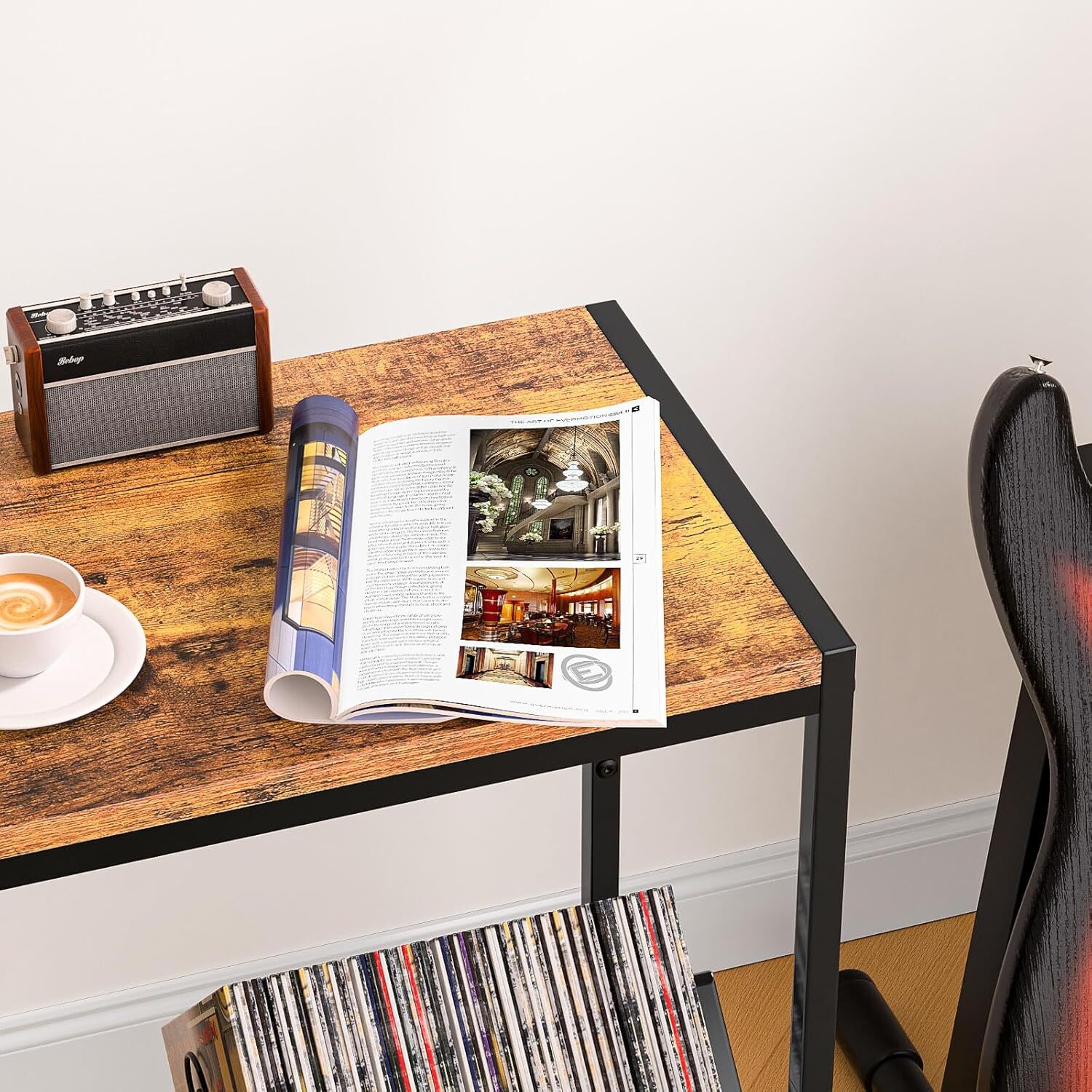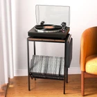 Facmogu Record Player Stand, 2-Tier Vinyl Storage Holder Rack, Black Product Details Material: Wood, Metal Color: Black Product Dimensions: 17.13"D x 13.2"W x 25.79"H Included Components: Assembly Guide Item Weight: 9.9 Pounds 【2-Tier Storage Space】-- The record player holder provides ample storage space. A spacious tabletop for CDs, radios, Bluetooth speakers and other audio devices; the second open storage tier holds up to 80 LP vinyl records and media essentials; and the side with non-woven storage pouch for keeping your frequently-used records or items ensures that you have easy access to your records and that keep your collection in order 【V-shaped Storage Design】-- The 2-tier vinyl storage rack features a V-shaped angled design that not only helps you access your vinyl records, books or magazines more easily and keep your vinyl records nice and organized, but also protects your vinyl records from falling or slipping while allowing you to add a decorative touch to your record table with beautiful record covers 【Premium Materials】-- Our vintage vinyl record table features high-quality sturdy brown wood grain and strong iron metal materials to ensure its load-bearing capacity, safety and long-lasting. The record rack is made of glossy baked enamel, which enhances durability and shows off elegance and beauty to showcase your unique taste, ideal for your record player and vinyl collection 【Easy Installation】-- The Record Player Table comes with assembly instructions and an installation video to make it easy to assemble this end table with magazine rack. In just 5-10 minutes, without a long, complicated assembly process, you will have a perfect and great storage capacity vinyl record holder to start enjoying your favorite music and displaying and storing your records 【Multi-Functional Holder】-- This 2-tier vintage minimalist vinyl record storage shelf not only can be used as a record player stand to collect and display your vinyl record collection and to store albums, books, magazines, documents, newspapers and office files, etc., but also can be used as a side or end table or nightstand for a small space, perfect for any living room, bedroom, study and office environments, adding a touch of vintage beauty to your home