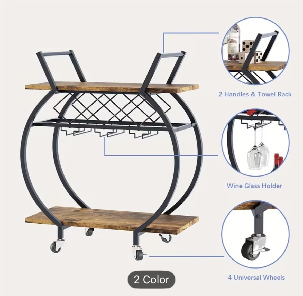 The 2-Tier Mobile Bar Cart with Wine Rack & Rolling Cart is a stylish and functional addition to any kitchen, bar, or living room. Featuring a heavy-duty metal frame, this contemporary cart has a 2-tier design with a wine rack for holding bottles of wine or other drinks. With a brown or white color option, this cart is easy to assemble and has four wheels for smooth mobility. Perfect for serving drinks and snacks while entertaining guests or simply adding a touch of convenience to your home.