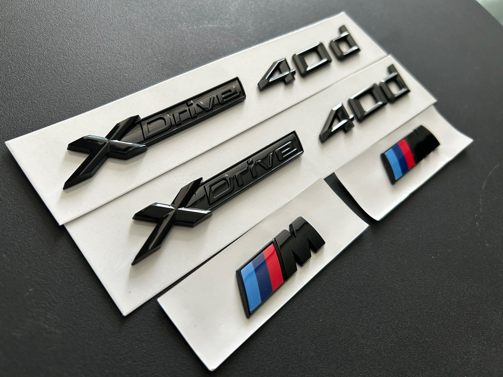 2X Xdrive 40d and 2X M WING BADGES IN GLOSS BLACK. FREE ALCOHOL WIPE Orders are dispatched same day with Royal Mail Tracked 48, if ordered before 16:00. Approximate Size: Xdrive 40d - 185mm x 15mm (with spacing) M Wing Badges - 45mm x 15mm If you have any questions, please do not hesitate to get in touch. Please follow the fitting instructions below to ensure a perfect finish: 1. When fitting ensure the area is clean, dry and free from oil wax grease etc. Use the free Surface Cleaner Sachet for the final clean. 2. Gently warm the surface and badge itself (sun, warm hair dryer, radiator for badge etc) **this is ESSENTIAL** 3. Use masking tape to make a template. 4. Peel off backing on adhesive letters (one at a time!). Place in respective position in template. Push and hold for 30 seconds to fit. 5. Once all letters are fixed remove template. 6. Admire a perfect finish refrain from washing or polishing for 48 hours. Performance Upgrades