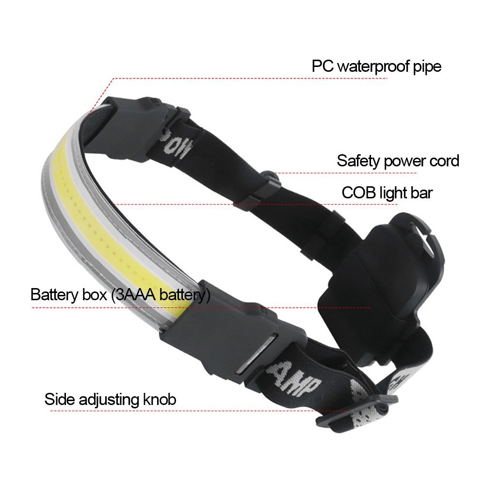 Headlight Battery Powered Head Lamp with 3 Light Modes for Running and Camping Bright Headlamp: This bright COB headlamp offers a 220° wide-angle illumination instead of lighting up only a small area in front of you, our headlight has upgraded light source with high lumens output for maximum brightness. Battery Powered: Powered by 3 AAA batteries (batteries are not included), the head light will last for a long time of continuous use. An adjustable headband and soft rubber battery compartment make running headlamp comfortable to wear. 3 Light Modes: Our Head Lamp has 3 white light modes of brightness to meet your daily needs: COB High Mode, COB Low Mode and COB Strobe Mode. And the on/off button allows you to easily cycle through the 3 light modes. Lightweight: The portable headlamp only weighs 3.5oz that you won't even feel it. Small size can easily fits in your pocket. Battery powered design is suitable for indoor and outdoor use. The light won’t bounce and shift around while you’re walking. Widely Used: This portable headlight is suitable for many applications such as camping, running, working, hiking or anything else you need a powerful hands-free light.The on/off button at the back of the battery compartment will also light up in red at the same time when the headlight is on, acting as a tail light. Product description Our COB headlamp offers a 220° wide-area Illumination and comes with comfortable adjustable headband. When the headlights are turned on, the on/off button on the back of the battery compartment will also light up in red as a taillight. Features: 220° Wide-Angle Illumination High Brightness Water Resistant Lightweight and Portable Comfortable Adjustable Headband It has 3 light modes: COB High Mode, COB Low Mode and COB Strobe Mode, which make it the perfect head lighting accessory for doing different tasks, camping, reading, walking the dog, hiking, climbing, and much more. This headlamp is powered by 3 AAA batteries (batteries are not included), suitable for indoor and outdoor scenes. Our bright headlight is water and impact resistant, it can withstand harsh weather conditions, including rain and snow. Package Contents: 2x wide beam cob headlamp 1x user manual