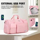 Garment Bags for Travel, 2 in 1 Convertible Carry On Duffle Bag Suit Bags Foldable Backpacks with Shoe Compartment & Toiletry Bag, Hanging Bags for Clothes Dress Suit for Men Women Gift (Pink) Product Details Color: Pink Brand: ACESAK MPN: Does not apply UPC: Does not apply EAN: Does not apply Package Dimensions: 13.07 x 10.55 x 5.2 inches Item Weight: 3.43 pounds Department: Unisex Adult Country of Origin: China Wrinkle-Free TravelThis portable garment bag for travel is crafted from high-quality polyester fabric with a durable zipper, offering resistance to scratches, tears, and water. It features a dedicated garment compartment with hooks and buckles to keep clothes wrinkle-free, along with two bottom clips to prevent garments from shifting. A separate zippered pocket for ties ensures your suits, jackets, or dresses stay protected and wrinkle-free during travel. Spacious Design & USB Port DesignThe hanging garment bag measures 20" x 12.2" x 13.1" when packed and unfolds to 20.2" x 44.1", providing ample space for long gowns or evening dresses. The compact size meets airline carry-on requirements, fitting easily in overhead bins or under seats. Outside with USB Charging Port, and inside with Power Bank Pocket, you can easily to charge your phone while walking. (POWER BANK IS NOT INCLUDED). Shoe Compartment & Wet/ Dry PocketThe side waterproof pocket of this travel hanging garment bag offers a separate area for shoes or dirty clothes, keeping them away from clean items. It also includes a toiletry bag for cosmetics or personal care products. Additionally, a large waterproof wet/dry compartment on the back provides extra storage for any travel needs. 4-in-1 Convertible Garment BagThis versatile bag transforms into a handbag, shoulder bag, casual bag, or backpack. With various compartments, this garment travel bag can hold 3-5 suits or dresses, 2 pairs of shoes, ties, toiletries, cosmetics, and electronics. A specialized wet/ dry compartment is perfect for underwear, swimwear, towels, or post-workout clothes, ensuring everything stays organized. Portable to Carry OutWith a comfortable handle, detachable shoulder strap, hidden padded backpack straps, and luggage sleeve, this garment bag for hanging clothes travel adapts to your travel style. Lay it flat to use as a hanging garment bag or zip it up into a compact travel bag. Stylish and functional, it's ideal for week-long business trips or romantic weekend getaways.