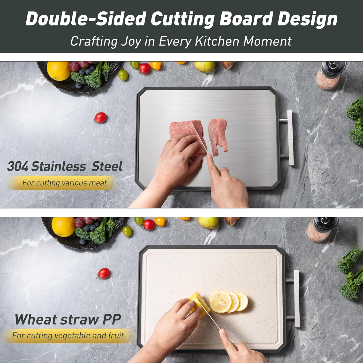Dual-Sided Cutting for Versatile Use:The Socisen cutting boards for kitchen features a stainless steel side for slicing meats and a PP side for fruits and vegetables. This dual-sided design ensures food safety and versatility, letting you handle different ingredients efficiently. Perfect for everyday cooking, this cutting board providing a durable and practical cutting solution for your kitchen needs. Good Design:The unique U-shaped handle, combining sleek aesthetics with ergonomic design, offers a comfortable and secure grip, making it easy to carry around the kitchen or take along for outdoor cooking. The built - in juice groove is a practical addition, efficiently catching the juices from meats, fruits, and vegetables, thus keeping your kitchen countertops clean. Complemented by non - slip mats on all four sides, the cutting board ensures stability during use. Durable & Food-Safe Materials: The Socisen cutting board features 304 stainless steel on one side and food-grade PP on the other, ensuring durability and safety. This dual-sided cutting board is BPA-free, making it safe for direct food contact. Perfect for slicing meats or chopping fruits and vegetables, its sturdy construction resists wear and tear, providing a reliable, long-lasting solution for all your kitchen tasks. Easy to Clean & Dishwasher Safe:The Socisen stainless steel cutting board is designed with non-stick surfaces, allowing for easy cleaning by simply rinsing with water and wiping dry. The cutting board is also dishwasher safe. We suggest using Quick Wash, Gentle Wash, or Normal Wash cycles for optimal results. Our cutting board's easy - clean features make it a great kitchen essential. Ideal Gift for Any Occasion: With its stylish design and elegant packaging, the Socisen stainless steel cutting boards for kitchen makes a thoughtful gift for Thanksgiving Day, Christmas, Mother's Day, Father's Day, birthday, anniversary, or housewarming event.And this cutting board can be used in the office or camping. Its versatile functionality and durable build appeal to anyone who loves cooking. Whether for a professional chef or a home cook, it’s a practical gift they’ll use every day. Product Description The video showcases the product in use. The video guides you through product setup. The video compares multiple products. The video shows the product being unpacked. Socisen Double-sided Cutting Board Merchant Video 1 Grip Handle 2 Hygienic Design 3 Non-Slip Design 4 Deep Juice Groove 5 Easy to Clean What materials are used in this stainless steel cutting board? Are they safe for food preparation? The non toxic cutting board features a dual-sided design: one side is made of food-grade 304 stainless steel, and the other side is crafted from wheat straw polypropylene (PP). How should I properly use each side of the double-sided cutting board? The stainless steel side is great for meats and easy to clean. The wheat straw side is ideal for fruits and veggies, and features a juice groove to help reduce mess on your countertop. Does the cutting board have features to prevent slipping during use? Yes, the 2 sided cutting boards for kitchen is designed with anti-slip rubber-wrapped edges and bottom, reducing noise and ensuring stability during use. This feature helps prevent the board from moving on the countertop while cutting. Can the stainless steel side be used as a defrosting tray? Yes, the 304 stainless steel side has good thermal conductivity, allowing it to function effectively as a defrosting tray for frozen foods, facilitating quicker thawing. Can I use this board for serving food as well? Absolutely! Its sleek, modern design and dual textures make it suitable for light serving — such as placing bread, cheese, or fruit. Just be sure to wash thoroughly between uses if switching between raw prep and serving. Socisen OTHER PRODUCTS! Add to Cart Add to Cart Add to Cart Add to Cart Add to Cart Add to Cart Add to Cart Customer Reviews 4.4 out of 5 stars 53 4.4 out of 5 stars 53 4.4 out of 5 stars 53 4.4 out of 5 stars 53 4.7 out of 5 stars 146 4.7 out of 5 stars 146 4.7 out of 5 stars 146 Price $18.99 $ 18 . 99 $28.49 $ 28 . 49 $29.99 $ 29 . 99 $28.49 $ 28 . 49 $23.99 $ 23 . 99 $35.99 $ 35 . 99 $45.99 $ 45 . 99 Quantity 1 1 1 1 1 1 2 Size 16.2"L x 11"W 16.2"L x 11"W 16.2"L x 11"W 16.2"L x 11"W 16"L x 11"W 16"L x 11"W 16"L x 11"W+18"L x 12"W Food Grade ✔ ✔ ✔ ✔ ✔ ✔ ✔ Easy to Clean ✔ ✔ ✔ ✔ ✔ ✔ ✔ Multiple Options ✔ ✔ ✔ ✔ ✔ ✔ ✔