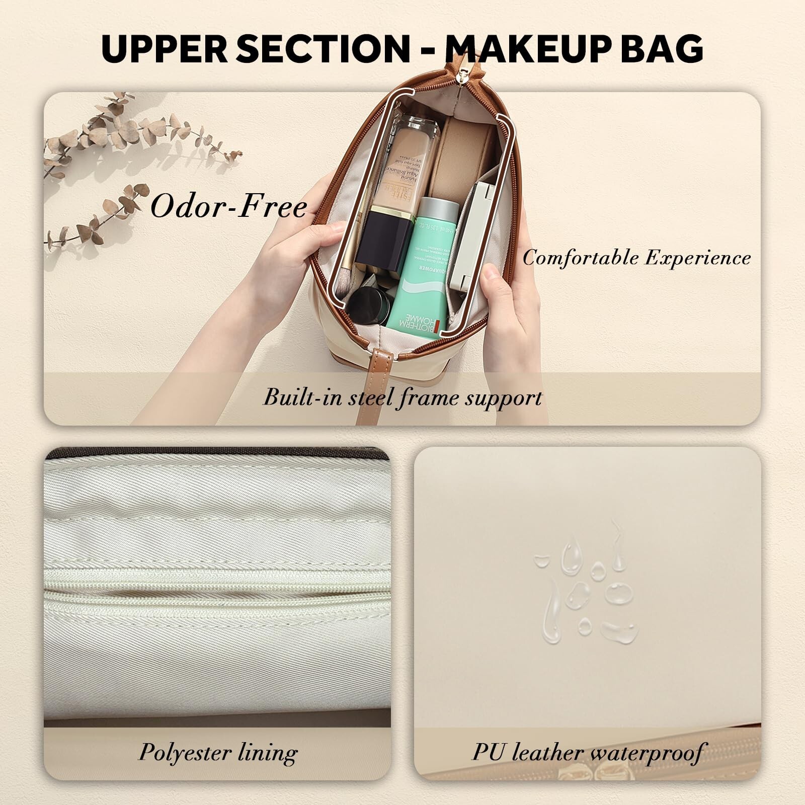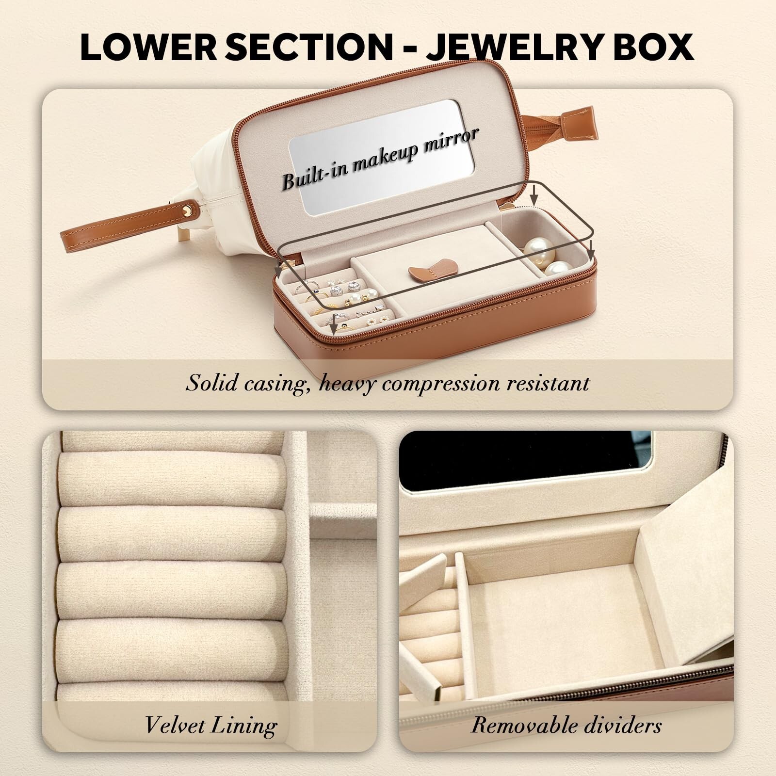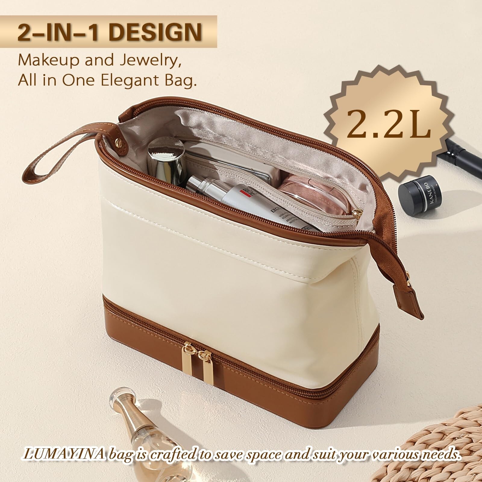 2-In-1 Jewelry Box and Makeup Bag with Mirror - Versatile Travel Jewelry Holder Organizer Cosmetic Bag, Portable Toiletry Bag with Integrated Jewelry Makeup Case for Women Men (White & Brown) Product Details Color: White & Brown Brand: Lumayina MPN: LM-1011B UPC: Does not apply EAN: Does not apply Product Dimensions: 8.2 x 4 x 6 inches Item Weight: 1.05 pounds Department: Womens Manufacturer: Lumayina Country of Origin: China Item model number: LM-1011B Easy Traveling: Our 2-in-1 combination of a travel cosmetic bag and jewelry case, featuring two storage pockets and a built-in mirror, ensure you travel in style without ever having to worry about forgetting your favorite jewelry or makeup essentials. With its simple and versatile look, this makeup pouch serves as a perfect travel essential for women. Quality Materials: The travel toiletry bag is crafted from waterproof, odor-free soft PU leather, ensuring your essentials are protected and your makeup bag organizer is durable. The premium lining is made of high-grade polyester for added quality, while the makeup box features robust stitching and a heavy-duty double zipper guarantee reliability and sturdiness. Smart Design: Measuring 8.2 x 4 x 6 inches, this makeup travel bag is perfect for small boarding luggage cases. The jewelry organizer, at a convenient 2-inch height, can easily accommodate toiletries, makeup, jewelry, and other travel accessories. Generous Storage: This makeup organizer travel set offers ample space. The top section is a spacious travel make up bag that can comfortably fit 12-16 cosmetic items, including brushes, perfumes, lipsticks, and eyeshadows. These dedicated trinket boxes can hold 12-20 pieces of jewelry, from earrings to bracelets and necklaces, and includes removable dividers for larger jewelry pieces. Sales Service: Lumayina offers high-quality jewelry and a 100% satisfactory shopping experience. We provide 24-hour resolution for any product inquiries.