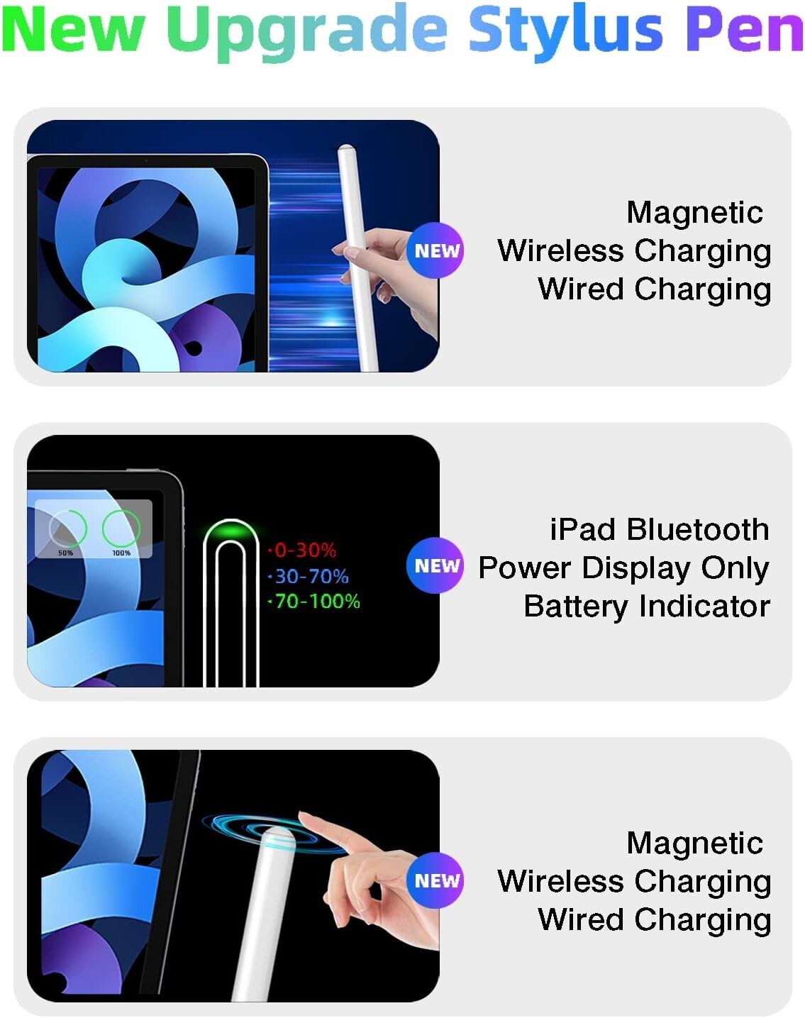 【How to Identify your iPad model】Tap on the "Settings"-- tap on "General"--Select "About"--Find the "Model Number". Or you can also look up the Model Number on the back of the iPad. The model number will typically start with the letter "A" followed by four numbers. For example, it may look like "A1983." This model number uniquely identifies your iPad model. 【Compatible Models】iPad pencil 2nd generation is suited for the Pad Air (4th/5th Gen), iPad Mini 6th Generation, iPad Pro 11"(1st/2nd/3rd/4th Gen), iPad Pro 12.9"(3rd/4th/5th/6th Gen)Note: Just work for the above model.Does not support any other iPhone, Android, or other devices. For specific models, please refer to the model diagram on the product introduction page. Before purchasing, please confirm whether your model is in the compatible model list. 【Bluetooth Magnetic Charging】The stylus pen for iPad supports Bluetooth connection and has a magnetic wireless charging design. Just connect Bluetooth and magnetically attach it to the side of the iPad to charge.(Please confirm whether your iPad model is compatible before purchasing. Incompatible models will not be able to charge.) Add the widget to check the power in real time. Charge it anytime and anywhere. It only takes 1.5 hours to charge fully and can last up to 9 hours operations within 20 minutes will enter sleep mode. 【Tilt Sensitivity & Pixel Precision】 The 1.2mm tip can execute finer instructions, the sensitivity is higher, and the signal is more accurate with no lag/breakpoint. The iPad pen offers a palm rejection function that allows you to rest your palm comfortably on the screen. Feel free to unleash your creativity on iPad. 【Shortcut Key Functions】Compared with an ordinary stylus pen, The 2nd Generation pencil has a shortcut key function, After connecting to Bluetooth, tap the button at the top to implement shortcut functions. One tap returns to the main screen, and double-tap back to the APP selection page. swipe from the bottom left to the top right corner of the iPad screen to take a quick screenshot.