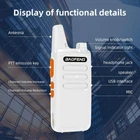 【 Lightweight and convenient 】Baofeng BF-888S upgraded version (T20) can communicate with BF-888S, and lightweight walkie talkies usually have a compact design, light weight, and are easy to carry. Its shape may be thin, making it easier to fit into a pocket or hang around the waist,package contains (walkie talkie, battery pack, Charger, belt clip, hand strap, Earpieces) X 2 and user manual. 【Long-Range communication】walkie talkies long range can reach 3 miles in open areas such as rural areas, suburbs or seaside, etc. where there is no shelter. If in cities or towns, walkie talkies can reach 0.6-1.2 miles in most cases. The actual distance Depends on the obstruction of the current environment. 【Durable battery】Under normal circumstances,walkie talkie can be used for 8-96 hours with a full charge, and up to 8-12 hours with continuous use. The actual time depends on the frequency of use;3-4 hours to fully charge a battery with 0 capacity,long battery life. 【Lightweight and compact, suitable for multiple scenes】Small size and light weight, Hard and durable shell, drop-proof, Rainproof, this Handheld two way radio transmitters are suitable for hotel management, villas, restaurant kitchens,outings,Outdoor mountain climbing, construction sites, factory warehouses, car driving, cruise ships, school,churches, retail stores and supermarkets, security personnel, construction personnel, safety maintenance personnel. FCC ID:2AJGM-T20 Product Description Small and compact This walkie-talkie features a very compact and lightweight design, measuring only 5.31 inches in size and weighing 113 grams. It is ideal for portability and use, providing convenient wireless communication functionality. A clear voice walkie talkie The Baofeng walkie talkie has excellent voice clarity, with clear and natural sound transmission, ensuring accurate and accurate communication between users without any blurring or distortion during the communication process, ensuring communication quality. Walkie talkies with multiple color options The Baofeng T20 walkie talkie offers three fashionable color options, including black, white, and red. Users can choose according to their personal preferences and usage scenarios to meet different needs and styles of users. Product series Digital walkie talkies, analog walkie talkies, civilian walkie talkies, private network communication, walkie talkie accessories.
