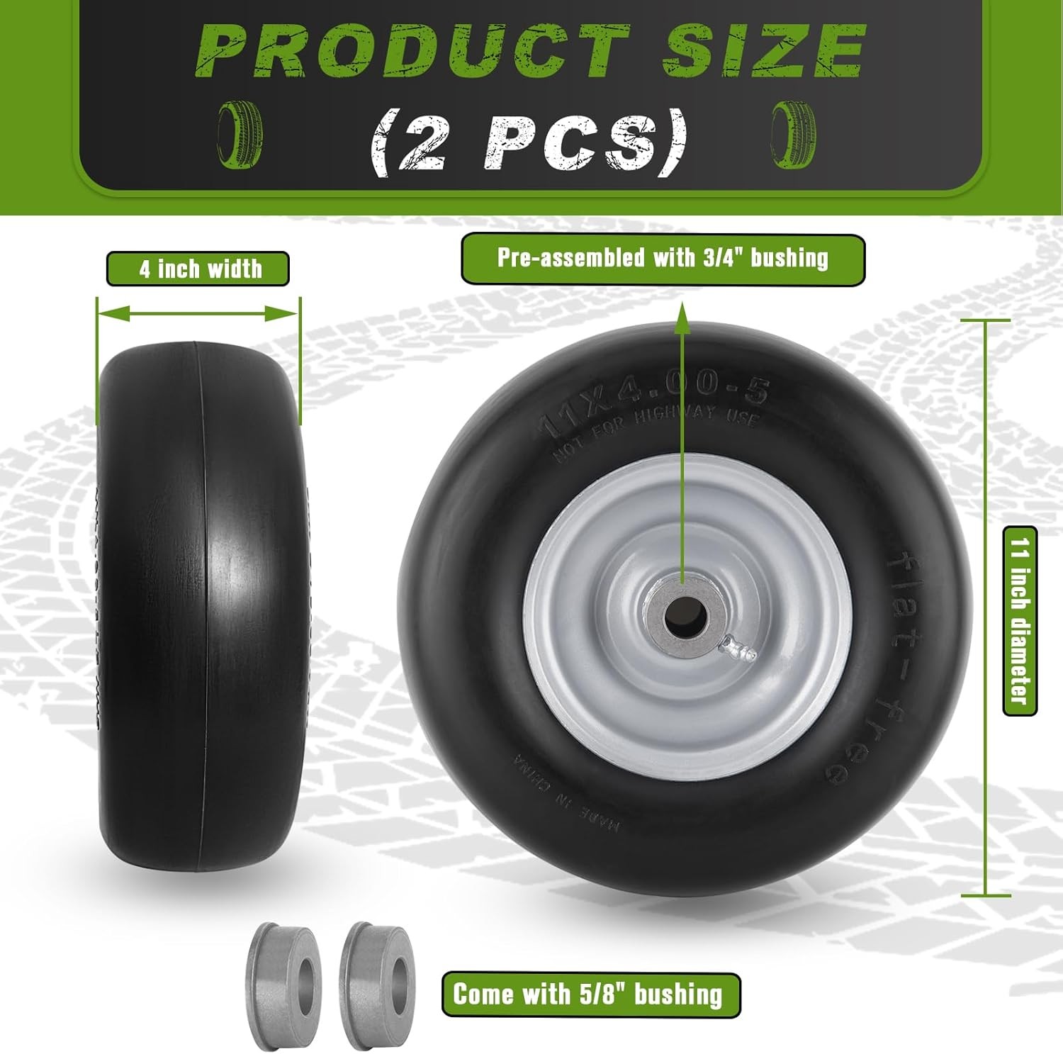 US Warehouse - FREE & FAST SHIPPING in USA Product Description: Tire: 2 pack 11x4. 00-5 flat free Smooth tread - check your existing tire Sidewall for tire and bushing size to ensure proper replacement fit Wheel: solid Black steel, 3.4" Centered hub, 3/4" Sintered iron bushings Universal adapter kit includes: 2 - 5/8" Sintered iron bushings, 2 - 1/2" Nylon Spacers, 2 - 1/4" Nylon Spacers, 2 - steel washers Use: replacement for front zero-turn mower tires 11x4. 00-5. Not for highway speeds Low hassle solution to repair or replace your mower tires 300 lb load capacity Feedback 1.Any question for your order, please contact us in time, we will reply to you within 24 hours and give you a satisfactory answer. 2.If you are satisfied with our products and services, hope to take up your little precious time to leave feedback reviews for our products.Thanks! 3.Your satisfaction is our effort. Welcome to order again! Have a great day! Our Policy 100% Satisfaction Guarantee Free and Fast Shipping in USA, US Warehouse 20% of restocking fee will be charged for returning item.