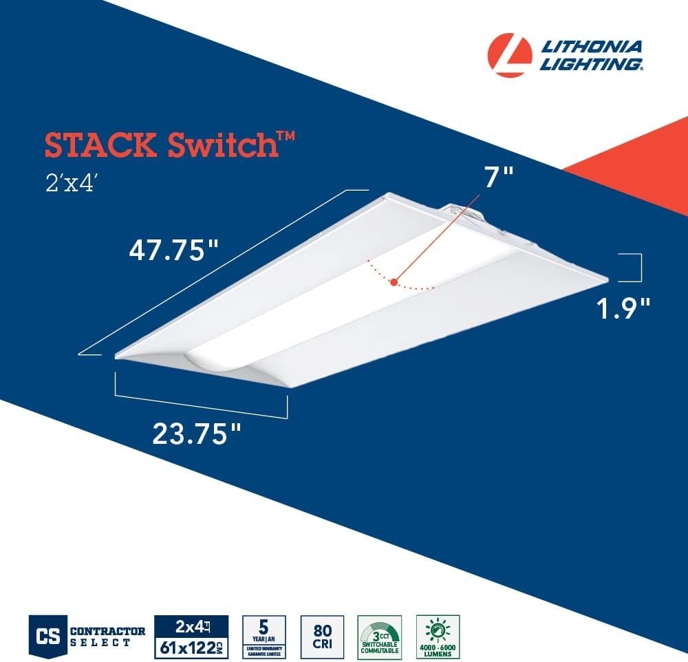 About this item TECHNOLOGY: The STACK LED Troffer with adjustable lumens & switchable color temperature offers superior quality & extended service with long-life LEDs and high-efficiency drivers; Simple switches allow you to set the perfect LED lighting for your space DESIGN: The wide center basket & curved matte reflector of the LED light deliver high-quality illumination & optimal performance; The glare-reducing matte white reflector enhances aesthetics & light diffusion; Looks great in offices, classrooms, and more RATINGS AND LONG LIFE: This ceiling lighting fixture is CCSA certified to meet US and Canadian standards, DLC qualified, damp location listed, and IC rated; Integrated LED lights deliver 80% LED lumen maintenance for up to 60,000 hours (L80/60,000) INSTALLATION: With a depth of only 1.9 in, the LED ceiling light is easy to install in restrictive plenum settings; Fits into standard 15/16 in & narrow 9/16 in T-grid ceiling systems; This is a great ceiling lighting solution for gyms, shops, and offices ADDITIONAL INFORMATION: Available in 2x2 and 2x4 configurations; Comes with a 5-year limited warranty; Lumen switch options - 4000/5000/6000; Color temperature options - 3500K (Neutral)/4000K (Cool)/5000K (Daylight) The 2x4 LED Troffer Light is a modern and sleek ceiling light designed for indoor use. It features a white aluminum construction with a matte finish, and emits a bright white light that can be dimmed for customized lighting. With a corded power source and control style switch, this LED drop-in ceiling light is perfect for kitchens, bedrooms, or home offices/study rooms. Its large 24-inch diameter makes it a stylish and functional addition to any space, providing energy-efficient lighting technology with a voltage output of 20V. Made in the United States, this troffer light offers a contemporary and versatile lighting solution for adults.