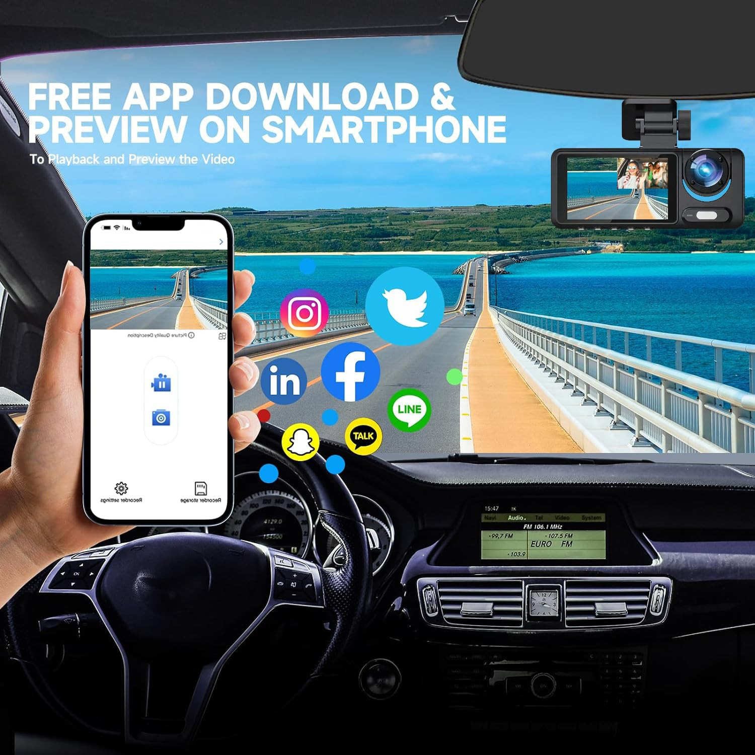 【1080 Full HD 3 Channel Dash Cam】Three-channel front, back and inside tachograph, which can simultaneously monitor the front and back of the vehicle or the front and interior, and provide audio. It helps you read key details such as road signs, vehicle number plates, etc. 【Dash Cam Front and Rear Inside with HD Display】Help deliver smooth 1080P front video + 720P cabin inside video + 720P rear video. It has a front wide Angle of 170 degrees and a back wide Angle of 140 degrees,120°Cabin Inside the camera, This can help you retain and provide evidence in unexpected situations such as collisions 【G-Sensor Dash Cam】Comes with a free 64GB SD memory card .When the storage capacity on the memory card reaches its limit, the newly recorded recording will automatically overwrite the old recording. Triggered by the G sensor, it can automatically detect sudden vibrations/collisions and lock the lens to prevent video from being overwritten, even during loop recording 【24 Hours Parking】The parking monitor of the car dash cam front and back will be automatically activated to records emergency videos upon detecting collisions, providing evidence in case of theft or accidents while parked. Provides 24 hours protection to you cars 【Super Night Vision 】The dash camera has a super night vision function, equipped with F2.0 large aperture and WDR technology, which helps to get clearer installation video and images in dark light conditions, suitable for use at night 【APP】You just need to connect the dash cam to you smartphone APP via WiFi and then you can use the “Viidure” app to view, playback, and manage the dash cam on your IOS or Android devices. Through the app, you can download the recorded 1080P videos directly to your phone. 【100% Satisfaction After Sale】dash cam are carefully made by our design team, if you have any product problems, you can always contact our customer service from our email or from the Amazon back office and we will give you a satisfactory answer.