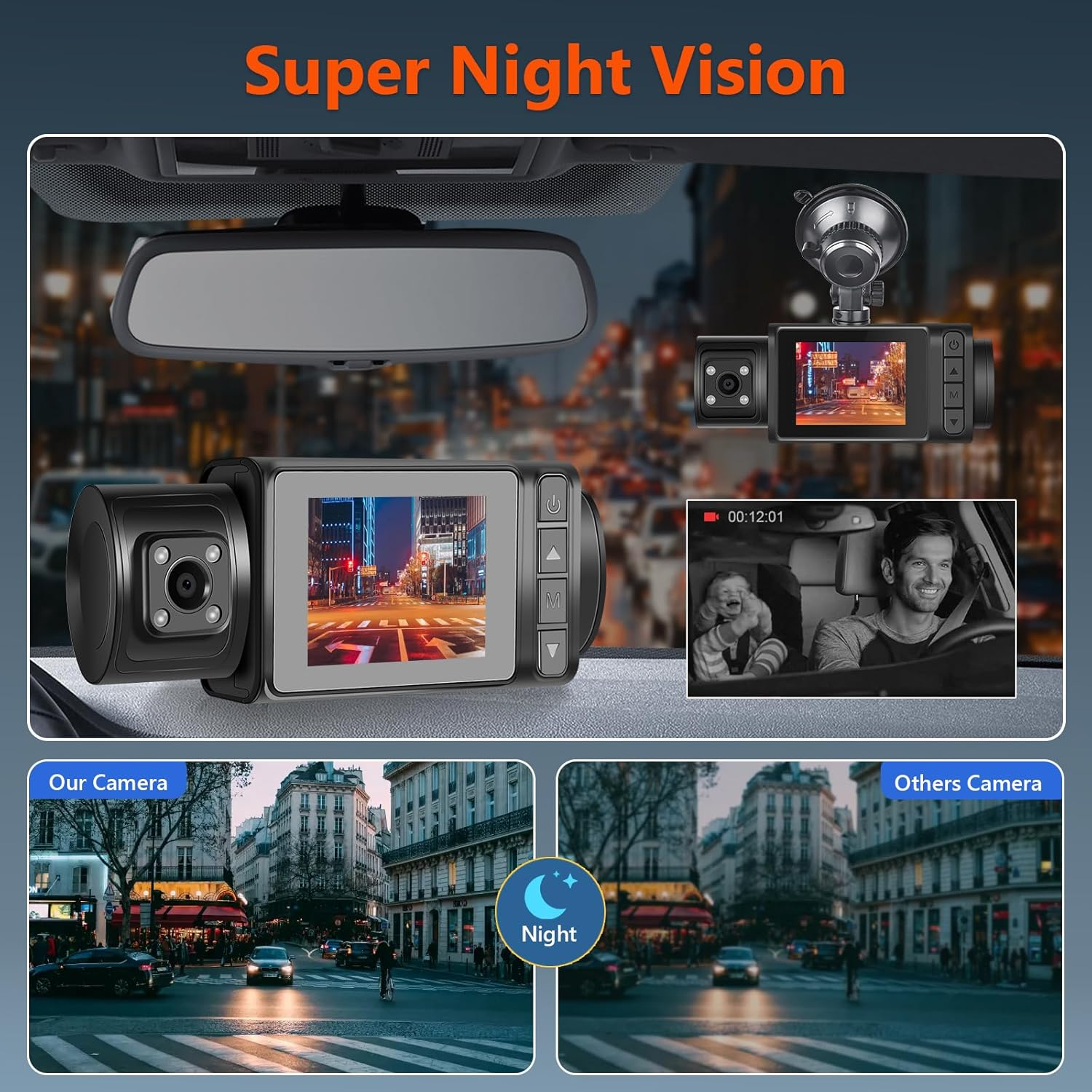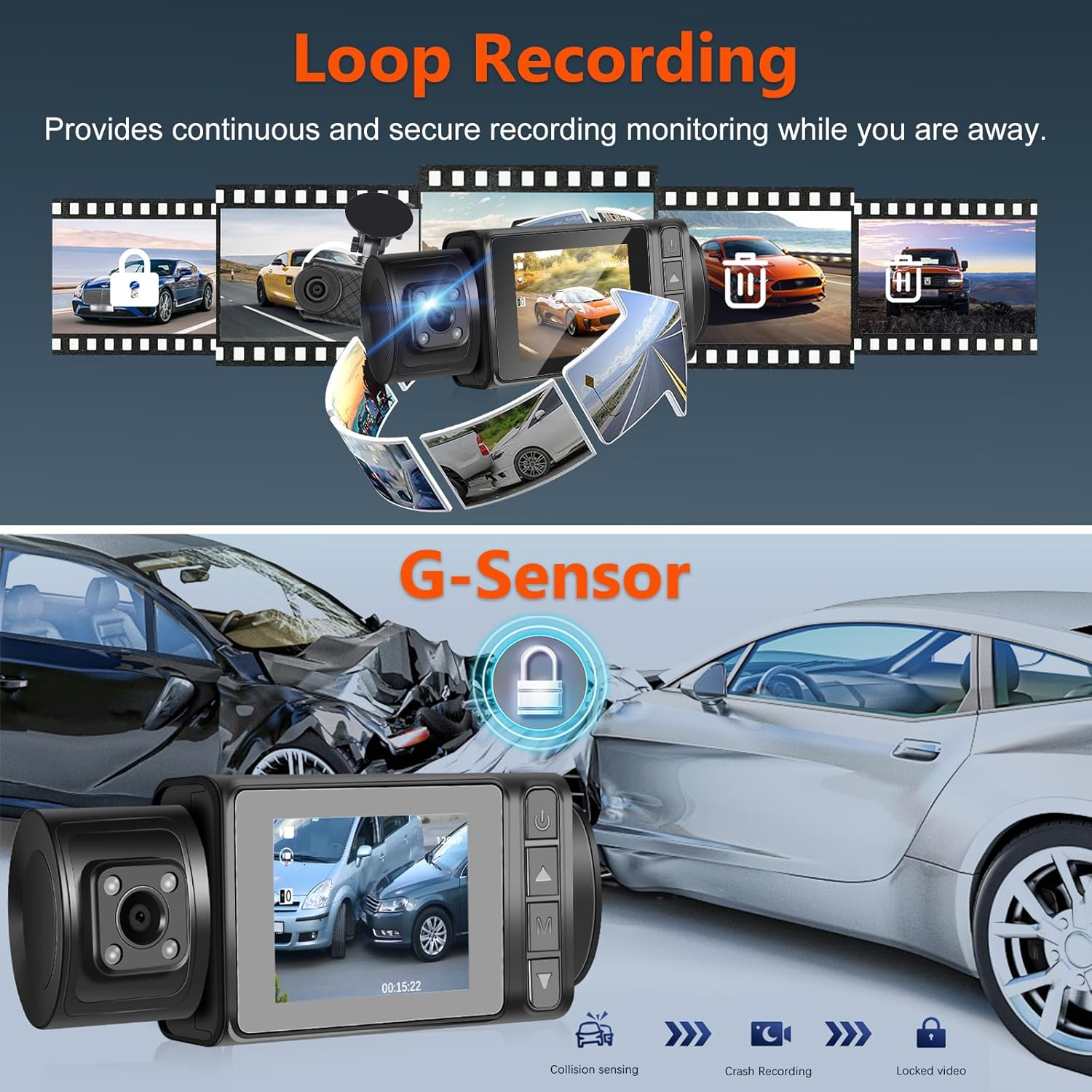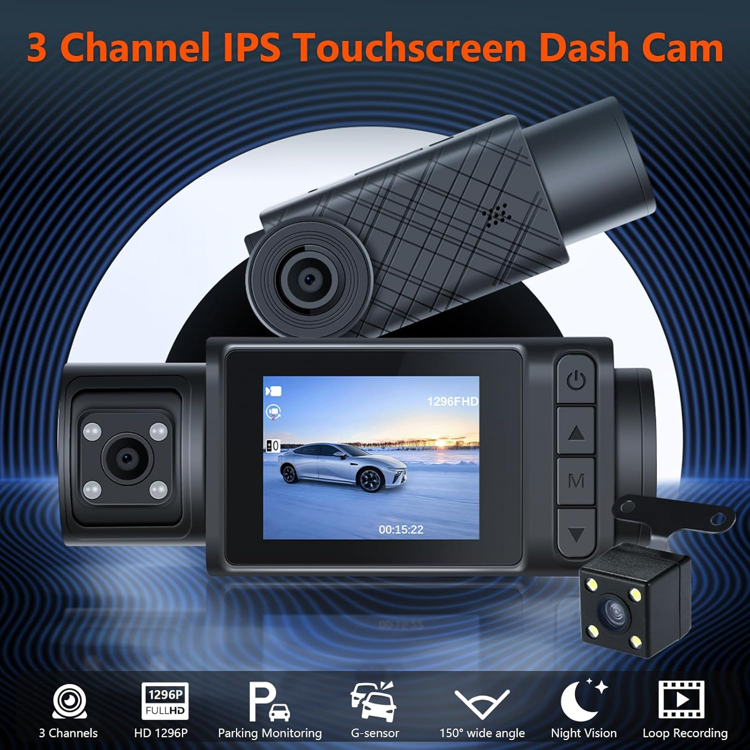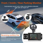 【Three-channel driving recorder】-The 3-channel driving recorder has a 150 wide-angle 1296P front camera +1296P+1296P IP66 waterproof rear camera to reduce visual blind spots.The screen made of 2-inch high-definition panel allows you to see clear images at any angle without any blur.The touch screen can easily switch between rear-view mirror view and front view.Covers every angle of the car,providing total protection while driving by capturing footage of the front,interior and rear of the car. 【Loop Recording & G-sensor Function】 - Provides continuous and secure recording monitoring while you are away. The dash cam records in a loop every 1/2/3 minutes until the oldest videos are overwritten by new ones. The G-sensor automatically detects collisions and locks the current video, allowing you to find valid evidence within the locked video. 【WDR HD Cameras, Night Vision】The camera adopted with WDR HD technology, it will offer clear and colorful image even at night, night vision, wide viewing angle of camera, with incorporated WDR&HDR tech balancing the lights, and the help of a sensor and 6-glass lens to capture higher quality images, driving at night or in any challenging lighting situations should be more effortless Product Description 1 24H Parking Monitor 2 Loop Recording 3 G-Sensor 4 Reversing Line