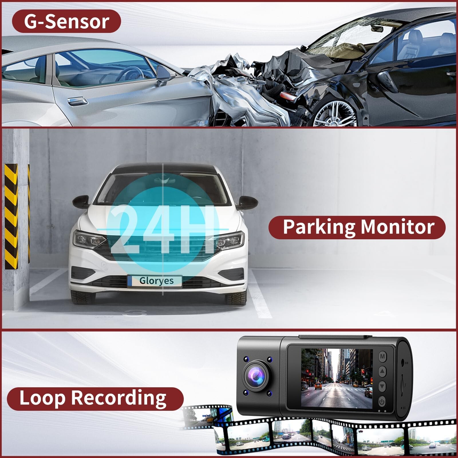 Dash Cam,3 Channel Dash Cam,2.5K/1440P Vital Dash Cam,Dash Camera for Cars,Car Dash Cam Front and Back,Triple Car Dash Camera Front and Rear Inside Loop Recording,Dashcam Night Vision,24H Parking,64GB Product Details Brand: Gloryes Model Name: A120-3 channel dash cam Orientation: Front and Rear and Inside Vehicle Service Type: Minivan, Bus, ATV, Motorcycle, RV, Car, UTV, Truck, Tractor Connectivity Technology: USB Special Feature: Loop Recording, G-Sensor, Night Vision, 2.Video Recording Options: Choose from Single Front 2.5K/1440P, Front + Inside, Front + Rear, or Front + Inside + Rear., 1.Parking Monitoring Mode: Automatically records within 1 second of a collision to capture surrounding conditions. See more Video Capture Resolution: 2.5K/1440P/ 1080P Included Components: Car Mount, Dash Cam Front Rear and Inside, Car Charger, Charging Cable, 64GB SD Card Mounting Type: Windshield Mount Control Method: Touch Product Dimensions: 0.39 x 0.39 x 0.39 inches Item Weight: 1.08 pounds Item model number: A120 Batteries: 1 Lithium Polymer batteries required. (included) Connectivity technologies: USB Special features: Loop Recording, G-Sensor, Night Vision, 2.Video Recording Options: Choose from Single Front 2.5K/1440P, Front + Inside, Front + Rear, or Front + Inside + Rear., 1.Parking Monitoring Mode: Automatically records within 1 second of a collision to capture surrounding conditions. Other display features: Wireless Whats in the box: Car Mount, Dash Cam Front Rear and Inside, Car Charger, Charging Cable, 64GB SD Card Manufacturer: Gloryes Country of Origin: China Date First Available: October 16, 2024 Select Recording MethodsHere are 4 Ways recording methods,you can choose which camera to use according to your needs for recording. 1. Only record the front of car, 2.5K/1440P resolution. 2. Record the front and inside of car. 3. Record the front and rear of car. 4. Record the front ,inside, and back of car. You have the Gloryes's 3 channel dash cam, which is equivalent to haveing 4 types of cameras(Front camera,Front+Inside cameras,Front+Rear cameras,Front+Inside+Rear cameras). 3-Channel Front Inside Rear Dash Cam The Dash Cam is a triple channel dash cam with 170 front camera, 150 inside camera and 150 waterproof rear camera, which can simultaneously monitor the front, rear, and interior of your vehicle while providing high quality video.The Screen made by IPS panel, It allows you to see a clear picture at any angle without any blurring.Perfect for family trips, Uber/Taxi /Lyft drivers Parking Monitor 1S RecordingWe constantly analyze the needs of our customers. And we deep improving the details of our products and realize the technical innovation. Gloryes dash cams can skip boot up and shoot directly within 1 second after vibration. The 3 channel dash cam front and rear inside records and locks the captured video in time. This feature of the dual dash cam front and inside will better protect your personal and property safety Loop Recording & G-SensorWhen the SD card of car dash camera is full, the new video will overwrite the oldest video. This dash camera for cars front and rear has a built-in G sensor, when the car is hit, the video will be automatically locked and retained without being overwritten by normal video 4 IR Cabin Light & Clearer Night Vision The car dash cam with super night vision and infrared cabin light uses f/1.8 wide aperture,coupled with 4 infrared lights, enabling the dash cam to show good color accuracy and clearly capture important details day or night(Without Bluetooth, WiFi, GPS, or APP functions, USB transmission is simpler and more stable, without worrying about disconnection) 24H Parking Monitor This car dash camera is used to protect your car after parking,with this function on,after you park the car and the camera powers off,dual dash cam will stay in standby mode,The front rear dash cam is sensitive to vibrations, waking up and recording a 30-second video upon detecting any movement(Please note that 24H Parking Monitor a hardware kit is needed.) Easy to Install and UseEasily and securely mount to your windshield in seconds using the included suction cup. Since dash cam front and rear car camera is powered by the cigarette lighter interface, it will automatically turn on and record when your car starts. You only need to press the "Power Key" button to stop recording and start the setting function. After-sales serviceSupports lifetime after-sales support, 1-year warranty and firmware upgrade services. In addition, if you have any questions about the product, we provide 7*24 hours after-sales service . You contact us freely, and we will answer and solve the problem quickly.