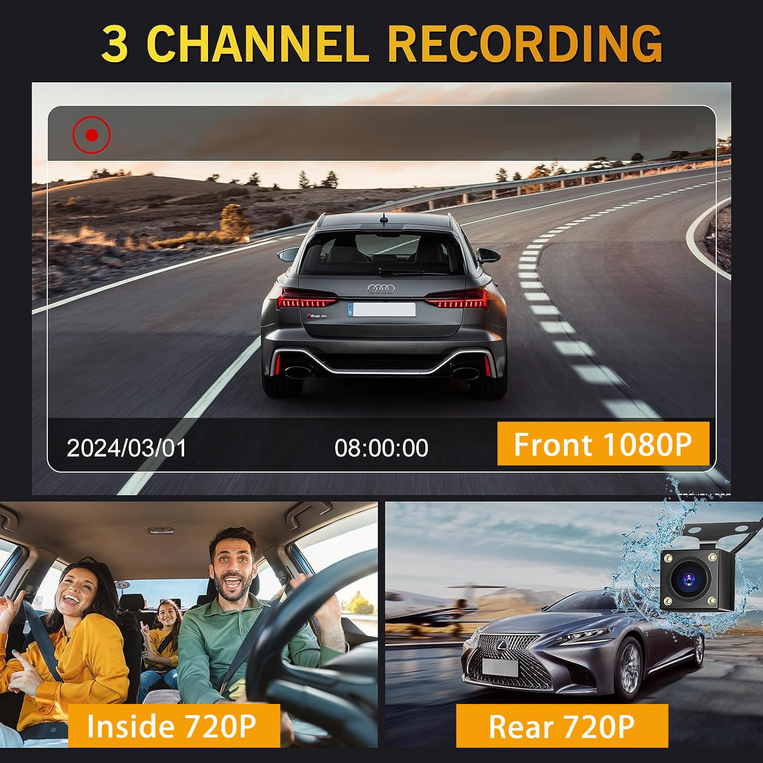 【1080 Full HD 3 Channel Dash Cam】Three-channel front, back and inside tachograph, which can simultaneously monitor the front and back of the vehicle or the front and interior, and provide audio. It helps you read key details such as road signs, vehicle number plates, etc. 【Dash Cam Front and Rear Inside with HD Display】Help deliver smooth 1080P front video + 720P cabin inside video + 720P rear video. It has a front wide Angle of 170 degrees and a back wide Angle of 140 degrees,120°Cabin Inside the camera, This can help you retain and provide evidence in unexpected situations such as collisions 【G-Sensor Dash Cam】Comes with a free 64GB SD memory card .When the storage capacity on the memory card reaches its limit, the newly recorded recording will automatically overwrite the old recording. Triggered by the G sensor, it can automatically detect sudden vibrations/collisions and lock the lens to prevent video from being overwritten, even during loop recording 【24 Hours Parking】The parking monitor of the car dash cam front and back will be automatically activated to records emergency videos upon detecting collisions, providing evidence in case of theft or accidents while parked. Provides 24 hours protection to you cars 【Super Night Vision 】The dash camera has a super night vision function, equipped with F2.0 large aperture and WDR technology, which helps to get clearer installation video and images in dark light conditions, suitable for use at night 【APP】You just need to connect the dash cam to you smartphone APP via WiFi and then you can use the “Viidure” app to view, playback, and manage the dash cam on your IOS or Android devices. Through the app, you can download the recorded 1080P videos directly to your phone. 【100% Satisfaction After Sale】dash cam are carefully made by our design team, if you have any product problems, you can always contact our customer service from our email or from the Amazon back office and we will give you a satisfactory answer.
