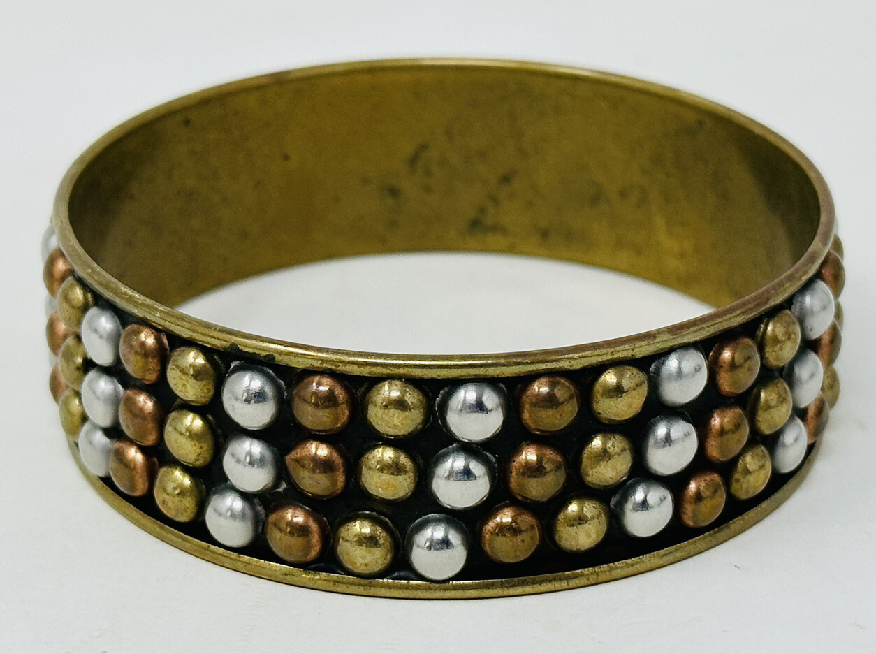 3 Bangle Bracelets Metal Studded Silver Gold Copper Tone Wood? Gold Tone Black Rhinestones All bracelets have some wear on the inside See all photos for condition and measurement details