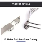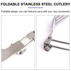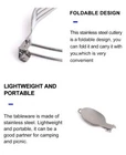 Title 3 pcs 1 set Portable Outdoor Camping Travel Picnic Foldable Stainless Steel Cutlery Set Spoon Fork Knife tableware Free Shipping Details and Description: Item: 3 pcs/set Outdoor Camping tableware cutlery Set Material: 304 Stainless Steel. Size: Folded size: 1*38*88 mm Open size: 1*38*154 mm Color: Silver Color Packing: Waterproof Nylon Container Bag. Package includes: Foldable Spoon * 1 piece, Table Fork * 1 piece, Table-Knife * 1 piece. Appliance: Your best Personal Cutlery Set for Outdoor Travel Camping Picnic Dinner. Features: 1. Foldable Design, Portable Size. 2. Stainless Steel Quality.