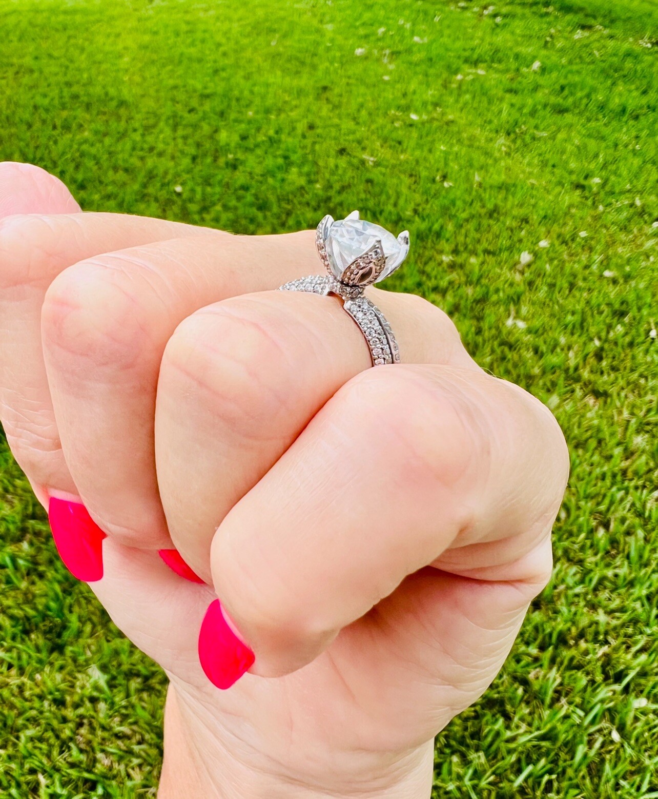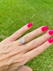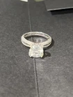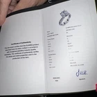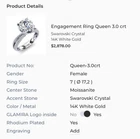 Name: GLAMIRA Ring Queen 3.0 crt Color / Metal: 585 While Gold GLAMIRA Logo inside:No Center Stone: Moissanite Color: G Clarity: VS Shape: Round Cut: Excellent Oty x Carat: 1 x 3 Accent Stones: Swarovski Crystal Color: White Clarity: AAAAA Shape: Round Cut: Very Good Qty x Carat: 140 x 0.005, 10 x 0.008 Date: 08/06/2021 This beautiful ring comes with the certification document that certifies that the GLAMIRA product described here has been crafted in accordance with recognised jewellery industry quality standards. The certificate of authenticity verifies the stone and metal properties used in the production of the item. Engraved with “Arm & Arm” - see photo.