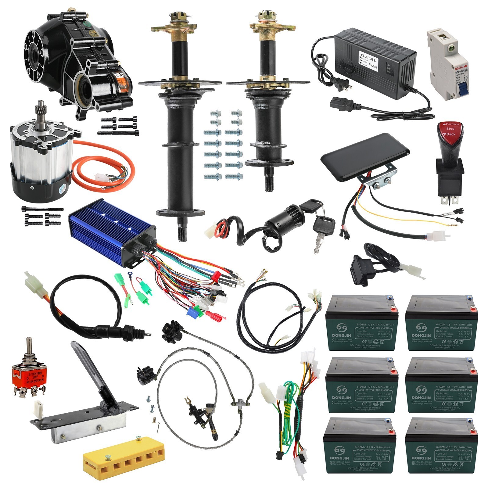 72V 1500W brushless DC differential motor Voltage(V): 72V Output Power:1500W Commutation: Brushless Speed(RPM): 4800rpm Rated current:18-35A Gear Ratio: 9.5:1 Torque: 2.62Nm High Speed : 20mph / Medium Speed : 16mph / Low Speed: 10mph 30" Differential Rear Axle Drive Shaft kit Axle Length: 30 inch Comes with pair axles Package Include: 2x Rear differential Axles 1x 1500w 72v brushless motor 1x 72v 1500w speed controller 1x brushless wiring harness 1x ignition key switch 1x 3 speed switch 1x throttle pedal 1x brake switch 1x charging port 1x terminal block 1x forward reverse switch 1x power indicator 1x brake caliper 1x 25ah air switch 6x battery 1x 72v charger Here is the instruction video: https://youtu.be/RoZE1SYAxHo Listing and template services provided by inkFrog