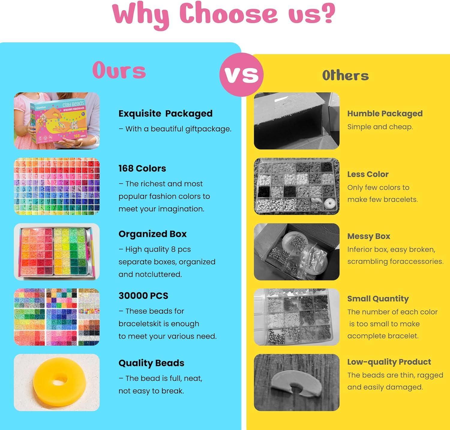 Menu Other Items Feedbacks About Us Contact Us Add To Favorites 30,000 Pcs Clay Beads Bracelet Making Kit, 168 Colors 8 Boxes Flat Preppy Beads for Friendship Bracelets, Jewelry Kit with Pendant Charms Elastic String Crafts Gift for Adults Kids 6+ ALL YOU NEED INCLUDED - The clay beads bracelet making kit provide 168 colors flat polymer clay beads with 27000pcs, and more than 2000 pcs charms kit. The rich accessories include letter beads, heart beads, smile face beads, evil eyes beads, square beads, star beads, pendants, charms, lobster clasps, etc. More than thirty kinds of accessories to meet your various DIY needs PREMIUM MATERIAL - These beads are crafted from polymer clay, it offers great plasticity and durability. The clay heishi beads have a diameter of 6mm, 2mm hole, and a thickness of 1mm. The clay beads designed for bracelets are light in weight. They don't fade easily, non-toxic, waterproof, making them comfortable to wear, whether you're at the beach or by the pool RAINBOW RICH COLORS BEADS - Total 8 box of this clay beads set, 168 different colors in 7 storage boxes, about 160+pcs/color, the accessories are placed in a dedicated box, which is easy to access, you can easily find it according to your needs. With a rainbow of eye-catching colors, you can create colorful and vivid artworks EXCELLENT BRACELET MAKING KIT - Use 168 colors and different types of beads and charms to create your favorite style. Parents can accompany your children to design various of jewelry, bracelets, necklaces, earrings, anklets, keychains, and DIY crafts. Children can create fun and beautiful handmade items, and stay away from electronic products like mobile phones. Women and girls can make a variety of friendship bracelets to wear when going to concerts FASHIONABLE CRAFT GIFT SELECTION - Exquisite gift box contains everything for a clay beads bracelet making crafts enthusiast. It makes an excellent present for girls between 6 and 14 years old. This charming craft kit is perfect for kids and adults, suitable for Birthdays, Valentine's Day, Mother's Day, Christmas, Thanksgiving Day, etc Product Description Perfect Gift for Girls Kids Exquisite gift box contains everything for a clay beads bracelet making crafts enthusiast. It makes an excellent present for girls! Excellent Jewelry Bracelet Making Use 168 colors and different types of beads and charms to create your favorite style! Rich DIY Crafts Meet Your Imagnation Can design various of jewelry, bracelets, necklaces, earrings, anklets, keychains, and DIY crafts. Children can create fun and beautiful handmade items! Friendship Bracelets for Concert Women and girls can make a variety of friendship bracelets to wear when going to concerts! Item Specification Item model number GL-CLAY8BOXES-30000 Item dimensions L x W x H 9 x 5 x 2 inches Color Rainbow Included Components Clay beads (168 colors, 27000 pcs), charms (2000+ pcs), letter beads, heart beads, smile face beads, evil eyes beads, square beads, star beads, pendants, lobster clasps, elastic string, instruction booklet Material Polymer Clay Country of Origin China Style Bracelet Making Kit Item Weight 9.2 ounces Theme clay beads Model Name GL-CLAY8BOXES-30000 Art Craft Kit Type Jewelry Making Number of Pieces 30000 Special Feature Clay Beads Product Dimensions 9 x 5 x 2 inches SHIPPING FREE FREE SHIPPING We are always working hard to ensure your package arrives as soon as possible. Please understand that some factors like weather, high postal traffic, and the performance of shipping companies are outside of our control. We offer free shipping to the lower 48 states. We do not accept P.O. Boxes. Please provide a physical address. If you have a problem or question regarding your transaction please contact us immediately. We will work with you to resolve any problem you may have. Thank you