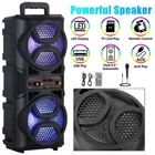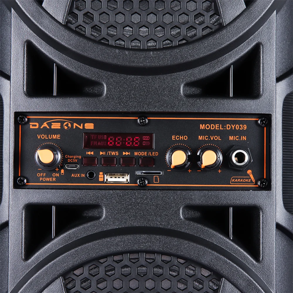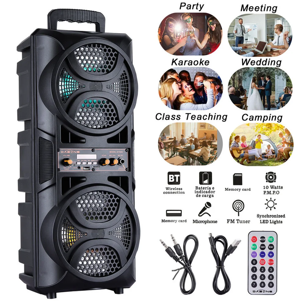 Features: Bluetooth Speaker: Your favorite music will smoothly come out from the Bluetooth speaker. Upgraded Blutooth chip ensures lower consumption and a stable connection between the Bluetooth subwoofer and your smartphone, tablet or other Bluetooth-enabled device within 10m/33ft. No cable and no hassle. Strong Bass: High-efficient 6.5" woofer emits deep bass while the mids and highs remain loud and clear even when the volume increases. Crank up the volume, feel deep, natural low vibrations and have a blast at your party. More Play Modes: When Bluetooth device isn't available, you can insert a U disk or TF card (support up to 32G), or connect to your 3.5mm audio player like MP3/MP4/MP5 to play your favorite tunes. Long Battery Life & Rechargeable Battery: Equipped with 2400mAh rechargeable battery, the speaker can keep running up to 6 hours in events such as outdoor live performances, BBQ, advertising activities, street speeches, school events, karaoke, Bon festival dance, etc. Karaoke Input: When connected to wired microphone, it can provide Karaoke function, allowing you to enjoy singing whether you are providing live streaming or joining in a party. Note: Microphone is not included. TWS Supported: Two speakers interconnect via Bluetooth and play together, offering enhanced bass and engaging atmosphere. Colorful LED Lights: 7 color LED lights accompany music, which is fashionable and cool. Perfect for patio parties or gatherings at night. Specifications: Output Power:10W. Power input:5V. Speaker Size:6.5*3Ω*2. BT Operation Distance:10m. Frequency Response:90Hz-20KHz. Sensitivity:≥60+2dB. Battery Capacity:1800mah. PlayTime(80%Volume) :3-5 Hours. Charging Time:3-5 Hours. Color:Black Product Dimensions:L210*W190*H495mm/L8.27*W7.48*H19.49inch. Package Dimensions:L222*W201*H513mm/L8.74*W7.91*H20.201inch. Product N.W: 2.15KGS/4.71LBS. Product G.W: 2.53KGS/5.58LBS. Package Includes: 1*ChargingCable 1*Manual 1*Auxin Cable 1x Remote control. 1* Micphone