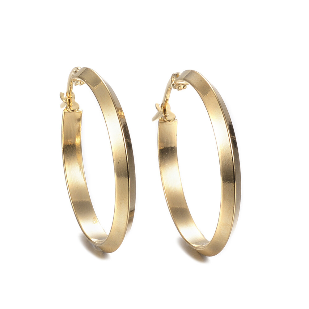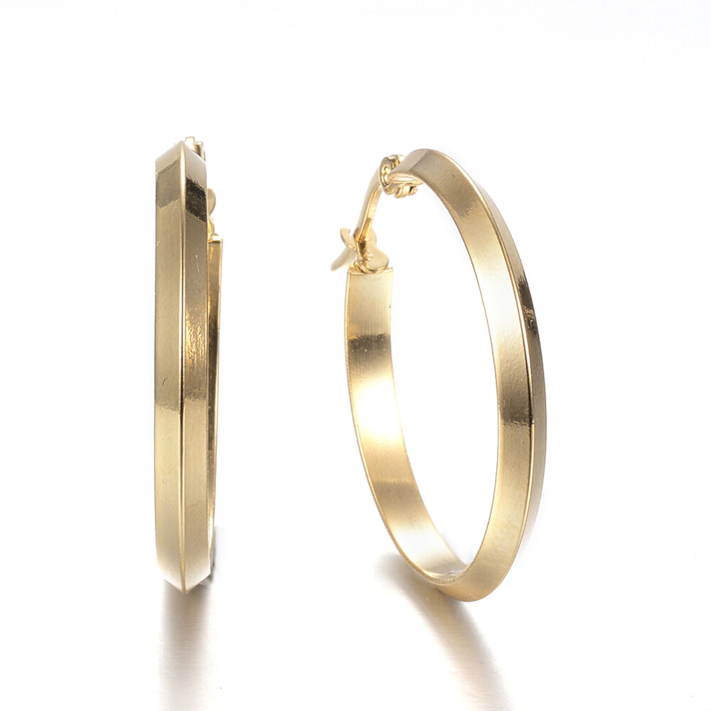 Specification Size Info Size 34.5x33x3mm; Pin: 1x0.8mm Material Stainless Steel Metal Color Golden Usage Earrings Package Size 1 Pairs per package Description: 304 Stainless Steel Hoop Earrings, Golden Size: about 0.6" up to 1.4" wide, 34.5mm long, 3mm thick; pin: 1x0.8mm.
