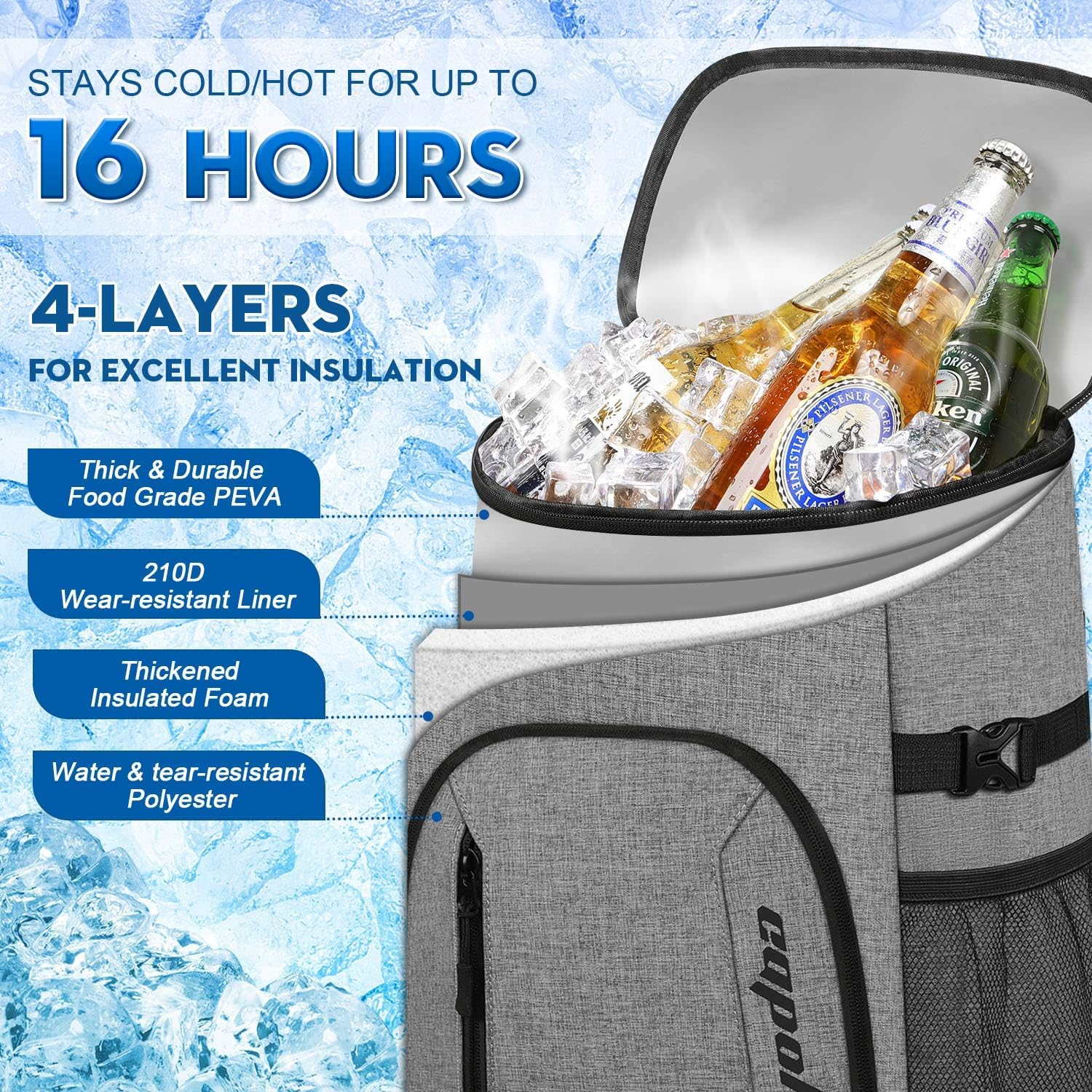 This cooler backpack is a game-changer for outdoor adventures! Keeps drinks ice-cold for hours with its thick insulation, and the spacious design easily fits 30+ cans plus snacks. Super comfortable to carry with padded straps, and the sturdy polyester material holds up well. Perfect for camping, picnics, or beach days—super convenient and leakproof. Love the sleek gray look too!