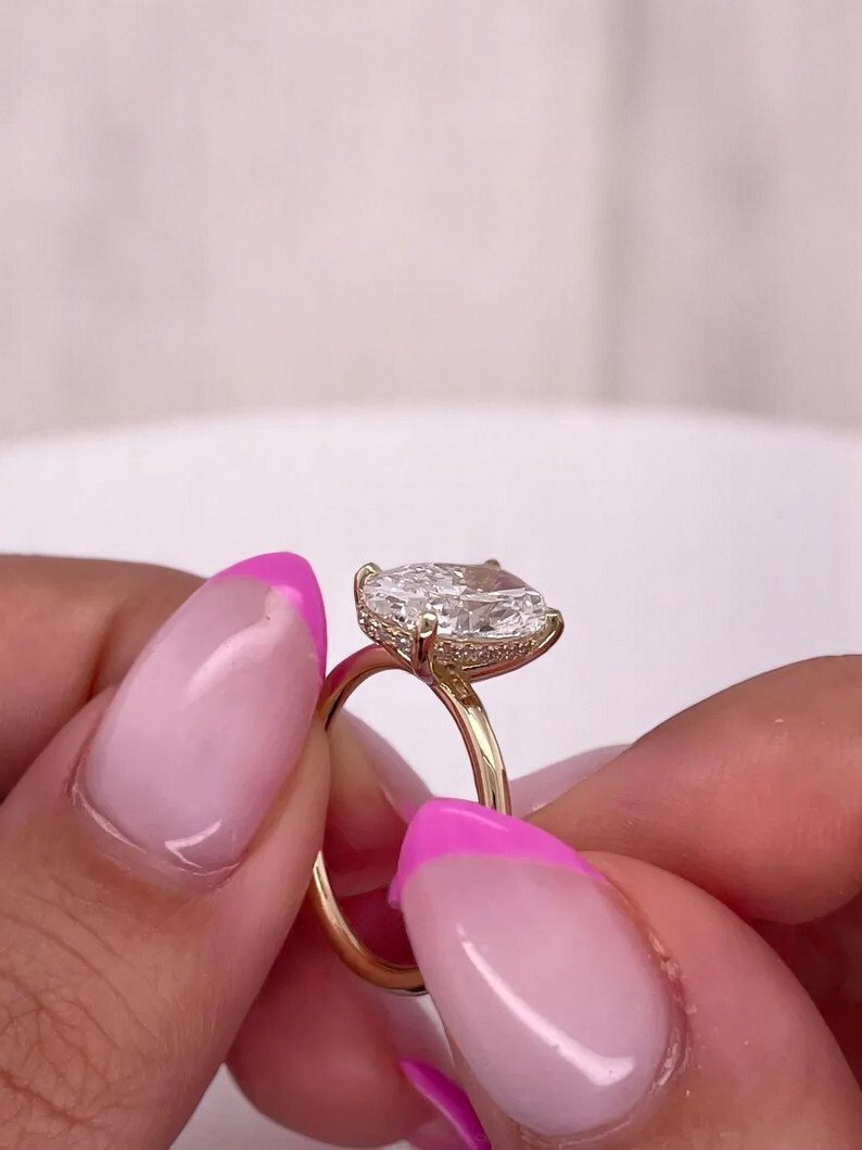 eBay Ecommerce Description 3.0CTW IGI Certified Oval Cut Lab Diamond Prong Set 14k Solid Yellow Gold Hidden Halo Ring The Ring Comes with IGI Certificate that shows Authenticity of the Diamond Metal: 14K Solid Yellow Gold (Stamped 14K) If you want the ring in White or Rose Gold please contact us Ring Size Options: 4 to 9 (Quarter Sizes are available upon request) If you cannot find your ring size, please contact us Shank Width: 2.0mm (Approx.) Hidden Halo on 4 Sides of the Ring (16 Rounds Diamonds) Diamond Information Lab Grown Diamond with IGI Certificate Carat Weight: 3.0CTW Diamond Cut: Oval Cut Diamond Color & Clarity: F Color, VS1 - VS2 Hidden Halo Diamond Carat Weight 0.25CTW Cut: Excellent The Ring comes in a Gift Box Please contact us with any Customization Requests Thanks for your interest