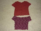 1. SO burnt orange short sleeve crop top, small 2. One Clothing pink romper, small 3. American Eagle striped shorts with ties, small 4. L.A. Hearts burgundy floral cropped top, small 5. Xhilaration black knit dress, small 6. Fila purple/gray fleece zip jacket, xs 7. The North Face gray zip jacket, small 8. American Eagle two tone gray sweater, small 9. American Eagle black/white sweater, small 10. Shein light blue/white floral top with ties, small 11. Hollister blue/white striped shorts, small 12. Hyfve yellow/white tank, small 13. American Eagle Mom jean, size 4 reg. 14. American Eagle jegging, size 4 reg. 15. American Eagle curvy highest rise jegging, size 2 reg. 16. American Eagle hi-rise jegging, size 0 short 17. Old Navy Santa lounge pants, xs 18. Under Armour dark gray joggers, small 19. Under Armour light gray joggers, small 20. Nike Pro navy blue compression shorts, small 21. Shein pink floral dress, small 22. Shein black stretch ruffle top, xs 23. Adidas black running shorts, small new with tags 24. Secret Treasures black/white polka dot lounge shorts, small 25. Wallflower denim shorts, size 3 26. Hollister denim shorts, size 0 27. Universal Thread light blue shorts, xs 28. SO black/white floral shorts, xs 29. H&M long sleeve floral blouse, xs 30. Blue Rain blue/pink floral dress, xs Smoke-free home. Please e-mail questions prior to purchase. SORRY NO INTERNATIONAL SHIPPING AVAILABLE. FLAT RATE SHIPPING FEE OF $24.99 TO ANY LOCATION IN THE LOWER U.S. 48 EXCEPT P.O. BOX ADDRESSES. Payment is due within 3 days from date of purchase. If you are not satisfied with your item, please contact us prior to leaving feedback. Thank you for looking!