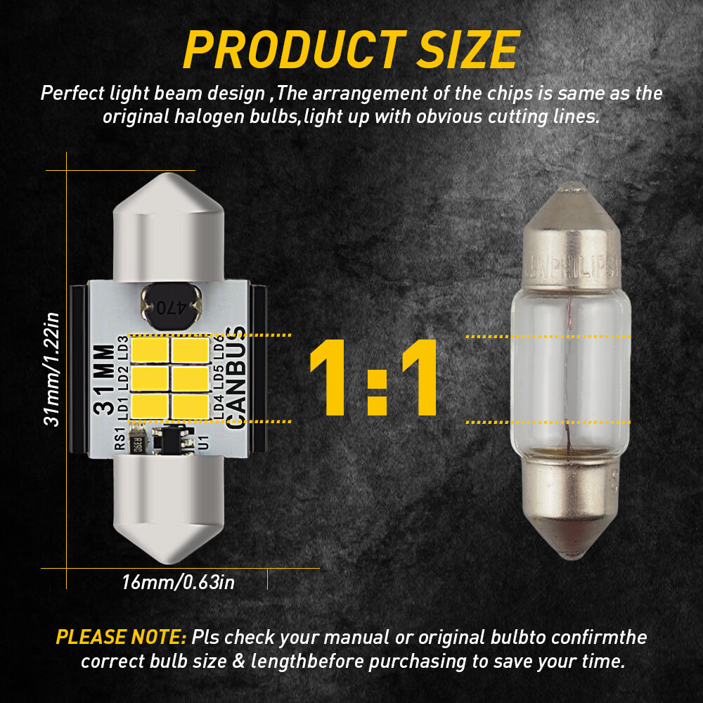 Description: AUXITO LED Lights bulbs as car Used for Map Lights, Door Lights, Parking Lights, Dashboard Lights, License Plate Lights , Trunk or Cargo Area Light , front/rear side marker lights,Interior Door Light,Reading Light,trunk cargo room lights,glove box lights, inner tail light bulb etc Specification: Model: 31MM DE3175 DE3021 Lumen:200Lm/per bulb, 400LM/per Bulb Set LED:6 Chps/per bulb, 12 Chps/per Bulb Set LED Chip: 3020-SMD LED CHIPS BULB Beam Type:360°Beam Angle Color:6000K Xenon White CANBUS:ERROR FREE Certified by:CE & ROHs Work Voltage:DC 12V Warranty:5 YEAR 31MM Festoon LED Interior Ceiling Dome Light Bulb 6000K White DE3175 Error Free Description: AUXITO LED Lights bulbs as car Used for Map Lights, Door Lights, Parking Lights, Dashboard Lights, License Plate Lights , Trunk or Cargo Area Light , front/rear side marker lights,Interior Door Light,Reading Light,trunk cargo room lights,glove box lights, inner tail light bulb etc Specification: Model: 31MM DE3175 DE3021 Lumen:200Lm/per bulb, 400LM/per Bulb Set LED:6 Chps/per bulb, 12 Chps/per Bulb Set LED Chip: 3020-SMD LED CHIPS BULB Beam Type:360°Beam Angle Color:6000K Xenon White CANBUS:ERROR FREE Certified by:CE & ROHs Work Voltage:DC 12V Warranty:5 YEAR Lifetime:More than 50000 hours Waterproof Level:IP65 Waterproof & Shockproof Package Included: 2x AUXITO LED Light Bulbs Item Specifics Brand AUXITO Light Color Cold White Number of Bulbs 2 Suitable For Dome Light License Light Bulb Fitment Code 31mm festoon/C5W Lumens 400 lm Color Temperature 6000K Placement on Vehicle Front, Left, Right Wattage 3.6W Ballast Included Yes Voltage 12V DC To Fit door light, glove box light, trunk light, license plate light Manufacturer Warranty 5 Year Country/Region of Manufacture United States Lighting Technology LED Size the same as the car original light Model LED Headlight Conversion Kit Features Ballast Included Lighting Type Specialty Head Light Bulb Material Aluminum alloy Sealed Housing Dustproof and Waterproof Heat control Heat Pipe Technology A380 Aluminum Heatsink Fitment Type Direct Replacement Universal Fitment Yes Vintage Part Yes Bulb Life Hours 50,000 hrs UPC 782890732055 Manufacturer Part Number AUXITO31mmDouble Fitment Type Direct Replacement Non-Domestic Product No Payment Variety of payment methods are accepted, such as credit, debit, gift cards, Apply pay, Google Pay, Paypal and Paypal Credit. Shipping 1. All items will be shipped in 24 hours after receiving your payment . 2. We ship this item to US only via USPS first class mail. It usually takes 3-5 working days to deliver. Returns 1. We offer 60 days return policy. 2. Please contact us if you have any questions with the products . 3. Refund will be sent after we got your returned package. 4. All returned items should be in the original packaging with tracking number. Contact Us We work from Monday - Saturday 9:00AM - 6:00PM, but we will reply once we get your message. There will be delay on response if you send message or E-Mail on Sunday. DESCRIPTION PAYMENT SHIPPING RETURN POLICY CONTACT US Shop Category Store Home LED Headlight ◈ 9005 HB3 ◈ 9006 HB4 ◈ H7 LED Fog Light ◈ H8 H9 H11 LED Plate Light LED Reverse Light LED Brake Light Rear Bumper Light LED Tail Light Tail Light assemblies Car Parts & Accessories ◈ LED Third Brake Light ◈ Other Parts & Accessories Other New List Item 2PCS H7 LED Headlight Bulb High Kit Low 44000LM Beam Super 6500K Bright White USD 24.99 For Toyota Tacoma Tundra RED OLED TUBE License LED Plate Light Rear Bumper Light USD 14.19 Pack of 2 for Honda Pilot Washer 2009-2015 Windshield Nozzles 76810-SZA-A01ZA USD 11.19 Front Rear Turn Lights Signal For NINJA KAWASAKI 250 400 300 650 Z650 Z900 Z1000 USD 16.99 Power Window Master Control Switch For Town Chrysler Dodge Front Driver Side NEW USD 24.99 Hot Item Rubber Seal Trim Prevent Water Leakage Windshield Sunroof Roof Top Window 10FT USD 12.99 FOR 94-04 MUSTANG PASSENGER or DRIVER SIDE MASTER POWER WINDOW CONTROL SWITCH USD 9.99 AUXITO Combo 4 9005 + H11 LED Headlight Kit Bulbs High Low Beam White 80000LM USD 35.99 Rubber Seal Trim Prevent Water Leakage Windshield Sunroof Roof Top Window 10FT USD 10.99 Auxito 9005 + H11 Combo LED Headlight 120W 80000LM High/Low Beam 6500K Bulbs Kit USD 46.99 Similar Item Excellent Delivery 31MM Festoon LED Interior Ceiling Dome Light Bulb 6000K White DE3175 Error Free Description: AUXITO LED Lights bulbs as car Used for Map Lights, Door Lights, Parking Lights, Dashboard Lights, License Plate Lights , Trunk or Cargo Area Light , front/rear side marker lights,Interior Door Light,Reading Light,trunk cargo room lights,glove box lights, inner tail light bulb etc Specification: Model: 31MM DE3175 DE3021 Lumen:200Lm/per bulb, 400LM/per Bulb Set LED:6 Chps/per bulb, 12 Chps/per Bulb Set LED Chip: 3020-SMD LED CHIPS BULB Beam Type:360°Beam Angle Color:6000K Xenon White CANBUS:ERROR FREE Certified by:CE & ROHs Work Voltage:DC 12V Warranty:5 YEAR Lifetime:More than 50000 hours Waterproof Level:IP65 Waterproof & Shockproof Package Included: 2x AUXITO LED Light Bulbs Item Specifics Brand AUXITO Light Color Cold White Number of Bulbs 2 Suitable For Dome Light License Light Bulb Fitment Code 31mm festoon/C5W Lumens 400 lm Color Temperature 6000K Placement on Vehicle Front, Left, Right Wattage 3.6W Ballast Included Yes Voltage 12V DC To Fit door light, glove box light, trunk light, license plate light Manufacturer Warranty 5 Year Country/Region of Manufacture United States Lighting Technology LED Size the same as the car original light Model LED Headlight Conversion Kit Features Ballast Included Lighting Type Specialty Head Light Bulb Material Aluminum alloy Sealed Housing Dustproof and Waterproof Heat control Heat Pipe Technology A380 Aluminum Heatsink Fitment Type Direct Replacement Universal Fitment Yes Vintage Part Yes Bulb Life Hours 50,000 hrs UPC 782890732055 Manufacturer Part Number AUXITO31mmDouble Fitment Type Direct Replacement Non-Domestic Product No P
