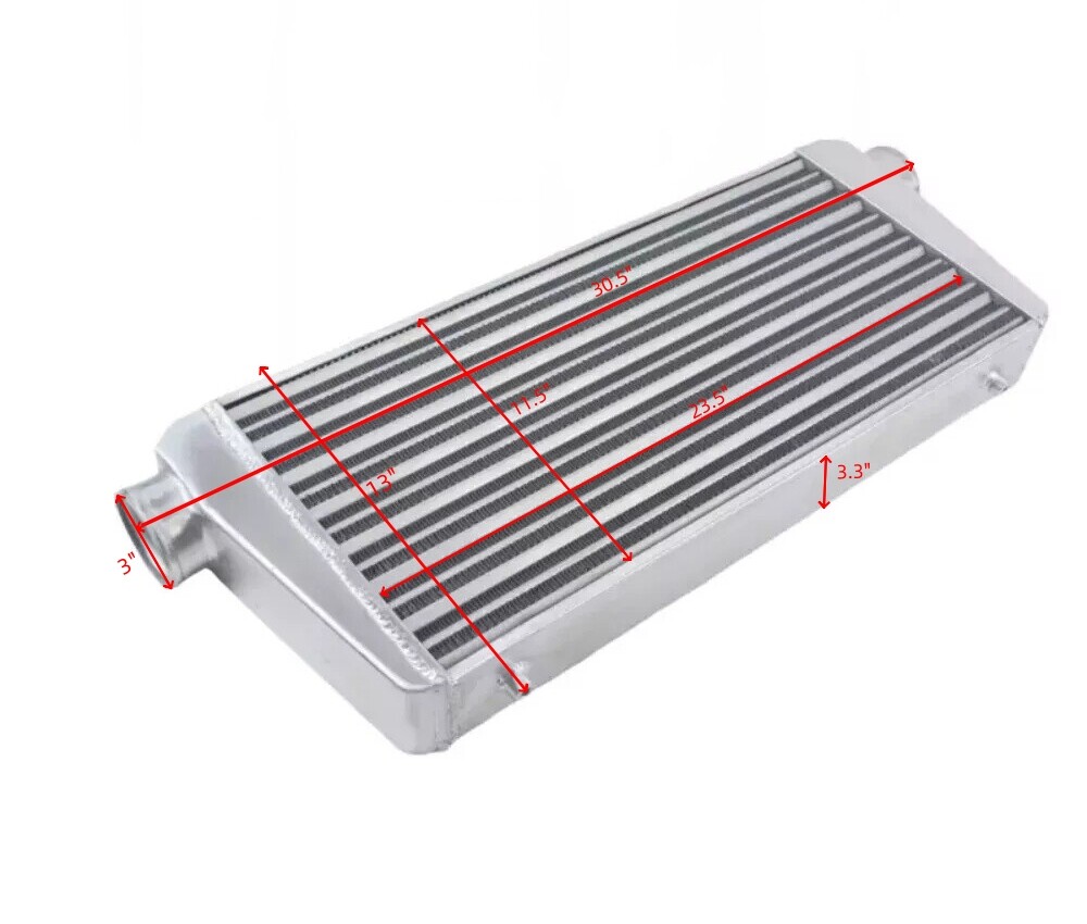 Specification: Part Name: Intercooler Material: Aluminum Core design: Tube & Fin Inlet/outlet Size: 3" Core Size: 23.5*11.5*2.7" Full Size: 30.5*13*3.3" Quantity: 1 piece Warranty: 10 year Condition: 100% Brand New Applaction: Universal (Please take correct measurements to make sure it will fit in the location) Package I ncludes: 1 x Universal Intercooler SHIPPING DOMESTIC LOWER 48 US STATES: FREE VERY IMPORTANT: Double check shipping address. We are not responsible for incorrect or undeliverable addresses. Product will be shipped within 1 business days after full payment is received and verified. Delivery Time is about 3-7 business days to most of countries. We ship the package to your shipping address in eBay instead of the one in PayPal. Please tell us your shipping address if it is different from the one in eBay. The tracking number will be given for the customer to check the shipping status online (registered or faster service only). We are not responsible for any wrong or undeliverable addresses. Please verify and update your shipping address on eBay during checkout. P AYMENT Item will be shipped out within 24 hours after payment cleared, except for weekends and holidays. RETURN 30 Days Free Returns, please notify us within 30 days after you've received your order. Please email us or call us to obtain a RMA (Return Merchandise Authorization) number from us, and have the RMA number written on the return package. Items to be returned must be in resalable condition. All returns are for refund ONLY. No exchange accepted. TERM & CONDITION: For emissions related items, please check with your local jurisdiction for emission specific requirements before purchasing. All items do not come with installation instruction unless otherwise specified. If item is questionable, please consult your local professional/mechanic before making purchase. Please leave us POSITIVE FEEDBACK and 5 stars DSR if you are happy with the transaction.