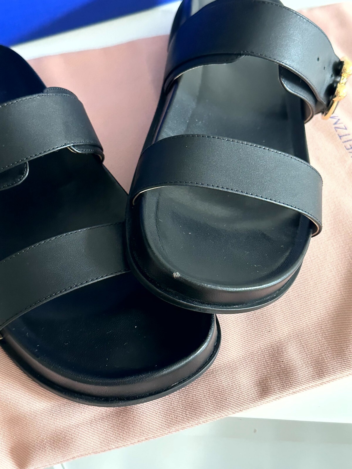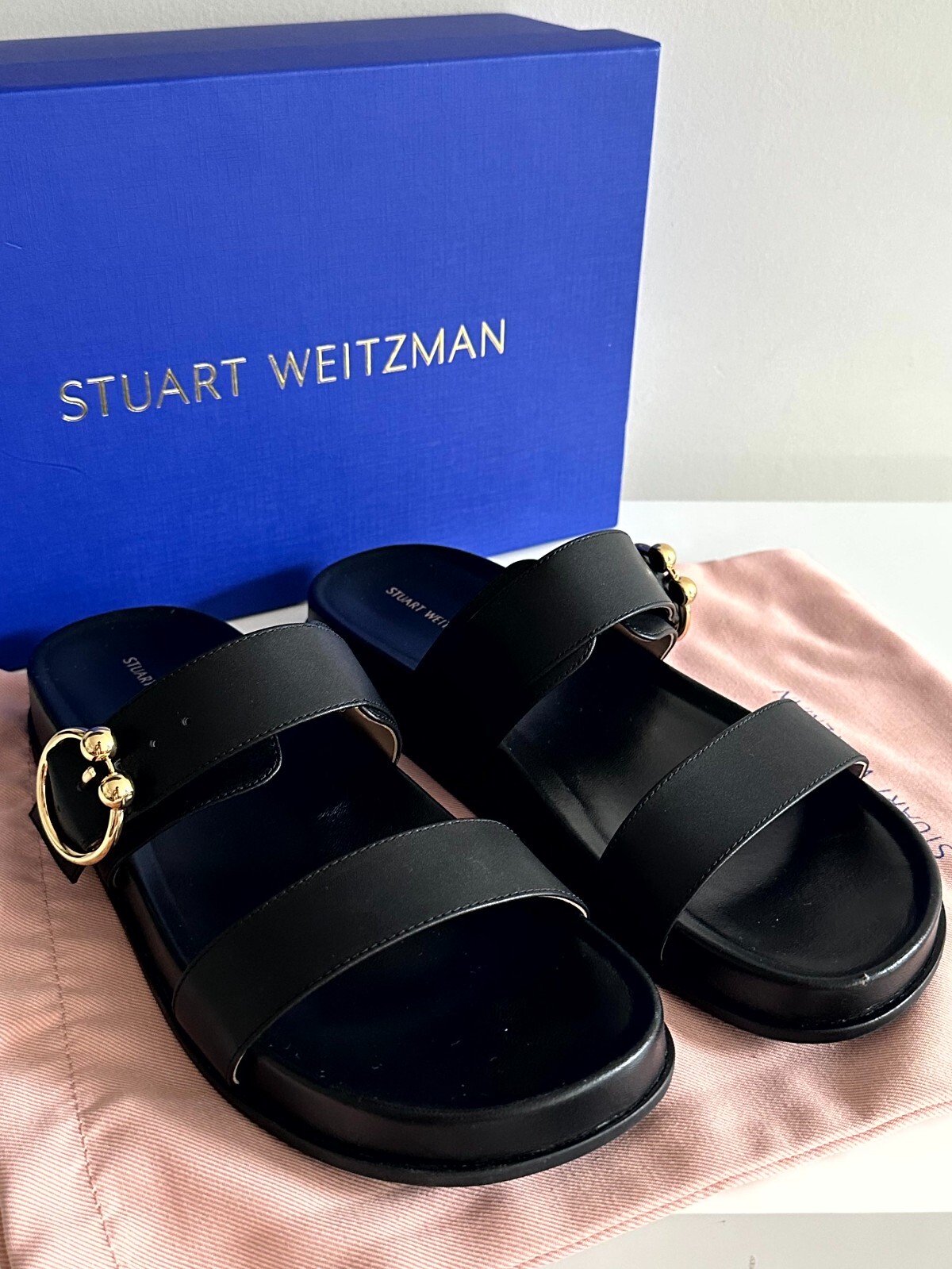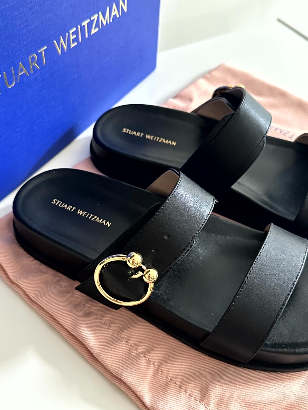 NEW WITH DEFECT! Comes with original box and dust bag size 9 Stuart Weitzman Joni Slide in black leather no marks of use small dent in the shoe as shown in picture number 5 fits wide feet, adjustable strap Measurements: Heel Height: 1 1⁄2 in Weight: 10 oz Platform Height: 1 in
