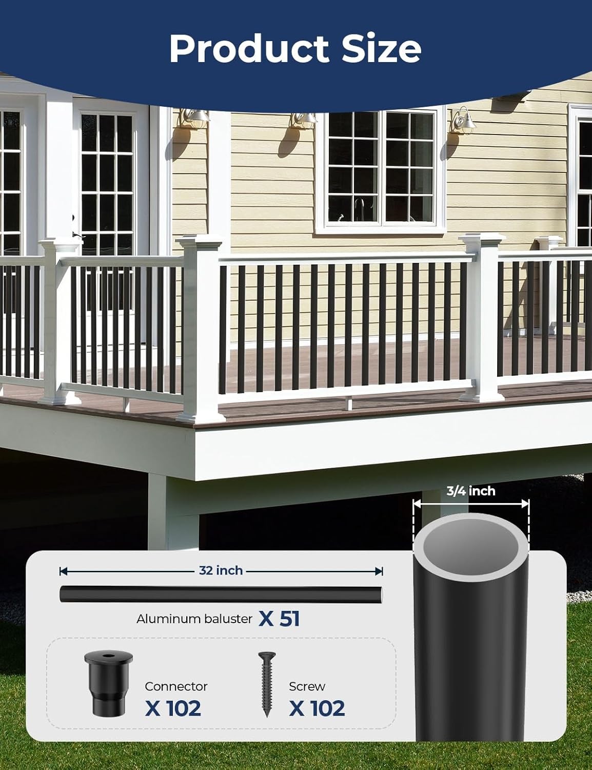 51-Pack 32" Round Aluminum Deck Balusters, Black Staircase 32", Product Details Package Dimensions : 35 x 10.75 x 3.75 inches; 16 Pounds Item model number : AR-DB3251-US Manufacturer : Arczorix Country of Origin : China Material: Aluminum Brand: Arczorix Color: Black Shape: Round Item Diameter: 0.75 Inches [Premium Quality Construction]: Made from high-quality aluminum, our 32" deck balusters are highly rust-resistant, durable, and built to withstand various weather conditions. The AAMA-2604 powder-coated surface ensures a matte, non-reflective, and durable finish that is environmentally friendly and glare-free, making it perfect for both indoor and outdoor use with no maintenance required. [Complete Set with Connectors]: Each package includes 51 aluminum balusters (32" in length, 3/4" in diameter), along with 102 connectors and screws for both level and stair railing installations, providing the perfect 32" rail height. [Hassle-Free Installation]: Pre-included connectors allow quick assembly without routing holes. Simply align the balusters, screw in the connectors, and attach the top and bottom rails for a secure fit. [Customizable Fit]: Thanks to the hollow aluminum design, the balusters are easy to cut for custom heights and can be installed on wood, composite, or aluminum railings, making stair remodels fast and efficient.