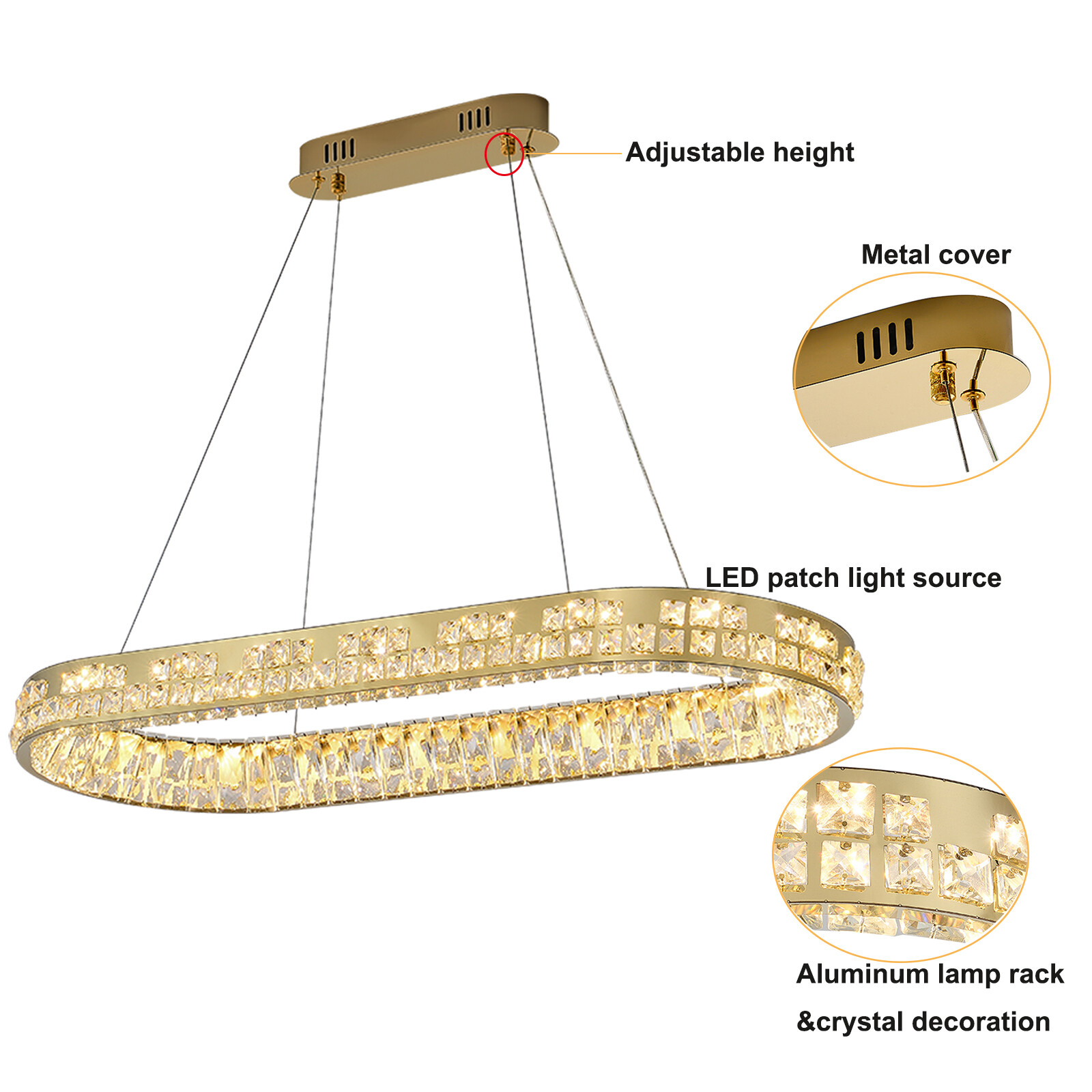 Specifications Material: Stainless Steel, Crystal Surface Treatment: Electroplating Style: Modern Shape: Oval Color: Golden Assembly Required: Yes Light Source Type: LED Applicable Space: 18-22㎡/ 193.75-236.8ft² Voltage: 110V Type: US Standard Power: 96W Color Temperature: 3000K-4000K-6000K Light Color: White, Neutral, Warm Light Lamp Size: 90*35*6.5cm/35.43*14.63*2.56in Chain Length: Adjustable 1.2m/47.2inch Base Size: 30*4*8cm/11.81*1.57*3.15in Package Included 1* Pendant Light 1* English Installation Manual All Accessories Required For Installation 35.4'' Modern Luxury Crystal Chandelier Ceiling Lamp Pendant Light Dining Room Description~~ Key Words: 35.4'' Modern Luxury Crystal Chandelier Ceiling Lamp Pendant Light Dining Room Description This LED pendant lamp uses a crystal lampshade with excellent light transmission to improve the light quality and create an amazing lighting environment. It is simple and exudes art, building an elegant and romantic leisure space for you. This lamp is your best choice both for decoration and lighting. Key Features 1. Three Light Colors: The white light is bright, the warm light is romantic and the natural light is comfortable. You can choose different lights to achieve different lighting effects, thus showing different atmospheres. 2. Adjustable Chain: The light's chain lengths are all adjustable to accommodate both high and low ceilings for better lighting and decorative effect. 3. LED Light Source: The light uses an LED light source, which is more efficient and energy-saving than other light sources, and the soft and non-stroboscopic lighting effect also takes care of the family's visual health. 4. Robust and Durable: It is made of high-quality crystal and stainless steel with a fine electroplating finish, which is resistant to corrosion, heat, and age. 5. 360° Illumination: The oval lamp body design allows for 360° illumination with a range of 193.75-236.8ft², illuminating your house with less dark areas. 6. Decorative Effect: The electroplating gold lamp base and crystal shade present its unique elegance and fashion that is ideal for all decorative styles. Even during the day, it will add glamour to your room. 7. Easy to Clean: The light has a simple structure and a smooth surface. When dust accumulates, you only need to use a towel to clean it. 8. Customer Service: We aim to provide quality products and services. If you have any problems, please feel free to contact us. We will reply and solve the problem for you as soon as possible. Details 1. Artistic Crystal Lampshade: The finely cut crystal lampshade with a clear texture not only provides good light transmission but also allows the bright light to be reflected from multiple angles, giving you a unique visual enjoyment. 2. Sturdy Base: The enlarged base (11.81*1.57*3.15in) provides firm support for a more secure installation on the ceiling. Application It is suitable for residential and commercial applications such as cafes, restaurants, bars, offices, living rooms, bedrooms, and kitchens to provide lighting and decorative functions with an illuminated area of 193.75-236.8ft². Specifications Material: Stainless Steel, Crystal Surface Treatment: Electroplating Style: Modern Shape: Oval Color: Golden Assembly Required: Yes Light Source Type: LED Applicable Space: 18-22㎡/ 193.75-236.8ft² Voltage: 110V Type: US Standard Power: 96W Color Temperature: 3000K-4000K-6000K Light Color: White, Neutral, Warm Light Lamp Size: 90*35*6.5cm/35.43*14.63*2.56in Chain Length: Adjustable 1.2m/47.2inch Base Size: 30*4*8cm/11.81*1.57*3.15in Package Included 1* Pendant Light 1* English Installation Manual All Accessories Required For Installation Notes 1.Please make sure that the power supply has been cut off before installation. 2.Please use the lamp within the applicable voltage range. Please allow the slight color difference caused by the shooting light and 1-3cm error due to manual measurement, and make sure you do not mind before you order. tu1 Payment Delivery details Terms of sales About us Contact us Payment We accept ebay payment 。 Fees such as import duties, taxes are not included in the item price or shipping costs. These charges are the buyer's responsibility. Delivery details Shipping: 2-9 working days to: USA Terms of sales We maintain high standards of excellence and strive for hundred percent customer satisfaction. Feedback is very important to us. We hope that you contact us immediately before you give neutral or negative feedback, so that we can address your concerns. It is impossible to address issues if we do not know about them! About us Your satis faction is our ultimate goal. We work hard to earn your trust and future business. Our certified technicians have tested each item before shipping. The unit comes with 1 year limited warranty on all manufacturing defects. a) If you receive a defective item, you may return it or ask for a discount. Please contact us within 14 days after you receive the package. b) What you returned must be intact and in its original packaging as re? u. Customer is responsible for shipping costs of the returned item. c) We will cover the cost of shipping back t with the shipping rate indicated in the registration page. We will send you a new unit or refund the full payment you paid. Thank you. Contact us Business Hour Business Hour: Monday To Friday: 8:30 AM to 5:00 PM (Beijing China time) Due to time zones, our reply to your questions may not be immediately. But within above working time, we will reply your email within 24 hours. If it's non-workdays, please kindly be patient and wait till Monday. Please contact us with ebay message. Please feel free to contact us if you have any questions. Monday To Friday: 8:30 AM to 5:00 PM (Beijing China time) Due to time zones, our reply to your questions may not be immediately. But within above working time, we will reply your email within 24 hours. If it's non-workdays, please kindly be patient and wait till Monday