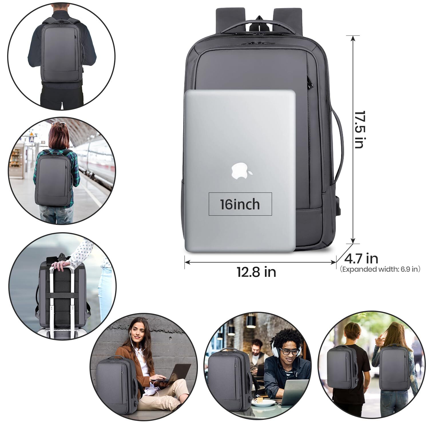 EXPANDABLE & SPACIOUS: Featuring an expandable width from 4.7” to 6.9”, this versatile backpack offers ample space for your essentials. Accommodates up to a 16-inch laptop or notebook, with a dedicated compartment that ensures secure storage. Dimensions: 12.8"L x 17.5"H x 4.7"W (expanded width: 6.9"W). Ideal for daily use, work, or travel. COMFORTABLE & BREATHABLE: Designed with a breathable and cushioned back panel, and adjustable shoulder straps, this backpack ensures maximum comfort even during long hours of use. The dual handles offer additional carrying options for added convenience. CONVENIENT USB CHARGING PORT: Equipped with an external USB charging port and an internal cable, this backpack allows you to charge your devices on the go. (Note: Power bank is not included.) WATER-RESISTANT & DURABLE: Made from high-quality water-resistant material, this backpack protects your belongings from light rain and spills. Its durable construction ensures longevity and reliable performance in various conditions. MULTIFUNCTIONAL DESIGN: Ideal for both men and women, this sleek gray backpack is perfect for work, college, or travel. It features multiple compartments for organizing your gear, and its stylish design makes it a versatile choice for any occasion.