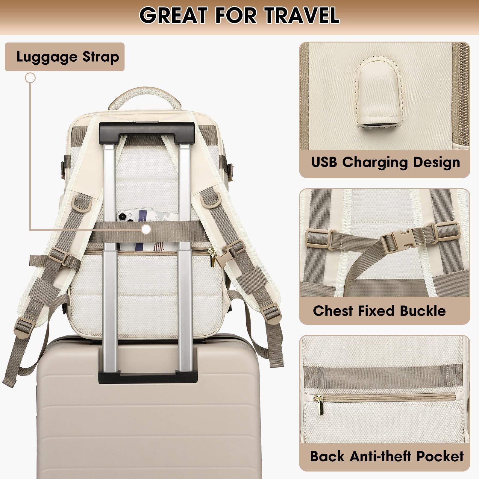 Amazing Deals Await! Welcome to my stores, The Smart of your choice and satisfaction guarantee. Travel Backpack for Women, 35L Large Carry On Backpack Flight Approved, Waterproof Personal Item Travel Bag fits 17 inch Laptop, TSA Backpack Suitcase with 2 Toiletry Bags & Shoe Bag, Beige Product Overview Key Features 35L Capacity with Laptop Compartment: This extra large backpack offers more packing capacity up to 35L for your travel. Travel backpack Size information: 11.5*7*17 inch (L x W x H). Main compartment has enough storage room to store 8 to 10 clothes and daily necessities. It also has built-in elastic bands to keep your clothes from falling out. Elasticated side pockets holds a 32oz water bottle and umbrella pretty well Designed for Travel: The luggage backpack is constructed to be most comfortable over hours of carrying, with multi-panel ventilated padding and adjustable and breathable straps which relieve the stress of the weight on your shoulders. Equipped with an adjustable chest strap, provides a wearing experience. A luggage strap to attach the backpack to your suitcase. An anti-theft back pocket is suitable for valuables. Features a USB port, which means you can charge your phone on the go Airline Approved Carry on Backpack: This TSA carry on backpack flight approved and fits under the seat or in the overhead compartment. The main compartment can be opened 180 degrees, allowing you to easily pass through security checks without paying extra for the flight. Additionally, the two-way zippers provide added security, making it the perfect personal item for air travel With 3 Packing Cubes & Wet Pocket: This extra large travel backpack is equipped with additional 3 storage pockets, including 2 carry-on storage pocket and 1 shoe pocket. Do not worry no separate place for shoes and cosmetics. The equipped dry and wet separation pocket can hold toiletries and wet clothes. Protecting your laptop backpack from getting wet. Personal item travel bag convenient for all your travel things Comfortable & Durable Material: Made of water-resistant polyester fabric and high-density nylon lining, which can provide protection on drizzle days. Sturdy metal double zipper and upgraded reinforced stitching make it last longer. Padded and breathable mesh back prevents overheating and promotes air circulation. A foam-padded top handle for a long time carry on Ideal Gift for Travel Enthusiasts: This luggage backpack is the choice for women and men's vacation, weekend getaway, overnight and bussiness trip. Carry on backpack for women travel bag is a perfect gift for birthdays, Thanksgiving, Christmas, New Year and Valentine's Day. Suitable for men and women, wife, girlfriend, mother, daughter and friends, it's a versatile companion as a travel backpack carry on flight approved, travel laptop backpack or personal item pack Payment Guidelines ⦿ Payment is processed through eBay's secure system. ⦿ We accept PayPal and major credit cards. Shipping Information ⦿ We ship to the address provided at checkout. Please verify your address before placing your order. ⦿ Orders are processed within 1 business day (excluding weekends and holidays). ⦿ Delivery typically takes 3-5 business days. ⦿ We use reliable carriers such as UPS, FedEx, and USPS. ⦿ Shipping is available only within the contiguous United States. No shipping to Alaska, Hawaii, Puerto Rico, or PO Boxes. ⦿ If you experience any delays, please reach out to us for assistance. Return Policy ⦿ We offer a 30-day money-back guarantee. ⦿ If you're not satisfied with your purchase, you can return it for a full refund. ⦿ Please contact us for the return address before sending any items back.