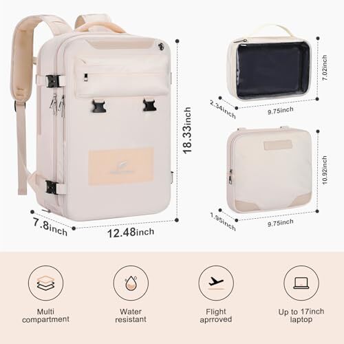 Return Policy Fast Delivery Trusted seller Travel Backpack for Women Men,35L Laptop Backpack Fits 17-Inch Laptop,Carry On Backpack for Airplanes with Crossbody Bag&Shoe Compartment&Toiletry Bag,Beige,Large Product Description Versatile Shoe Compartment: This travel backpack features a dedicated shoe compartment, keeping your shoes separate and organized. Its breathable design ensures freshness and easy cleaning, making it an ideal choice for a travel backpack or hiking backpack. Enhanced Device Protection: Safeguard your laptop or iPad during travel with the padded compartment in this laptop backpack. It provides reliable protection against bumps and scratches, ensuring the safety of your devices. Airline Approved: Our carry on backpack for airplanes meets airline standards and fits perfectly both under the seat in front of you and in the overhead storage compartment, offering ample space to store all your travel essentials while ensuring it remains compact and lightweight for easy maneuverability. Convenient Travel Features: Enjoy hands-free transportation with the luggage belt that securely attaches the backpack to your carry-on luggage. This lightweight carry on backpack is designed for easy travel and also includes a back anti-theft pocket to keep your valuables safe and secure.The elasticated side pocket of this versatile backpack securely holds water bottles, umbrellas, and other travel essentials. Detachable Crossbody Bag: This waterproof laptop backpack women effortlessly transitions to a stylish crossbody bag, making it suitable for various occasions. Its versatile design caters to different needs and preferences.When using as a crossbody bag, take the interlayper out of the back zipper pocket and attach it to Velcro hook to avoid rubbing clothing. Shipping Returns Payment Shipping Shipping is FREE to all addresses other than APO/PO boxes in the lower 48 states. All our stock ships from US-based warehouses. Shipped via USPS or UPS (depending on location and package weight) Unless stated otherwise, all orders will ship within 24-72 hours of your payment being processed. Check our feedback to see the great reviews of FAST shipping we offer. Returns Seller does not accept returns Payment We currently accept payment via eBay managed payments only. Once payment is cleared, we will dispatch your shipment within 1-3 business days. Please refer to the "Shipping" tab for more information regarding shipping speed to your destination.