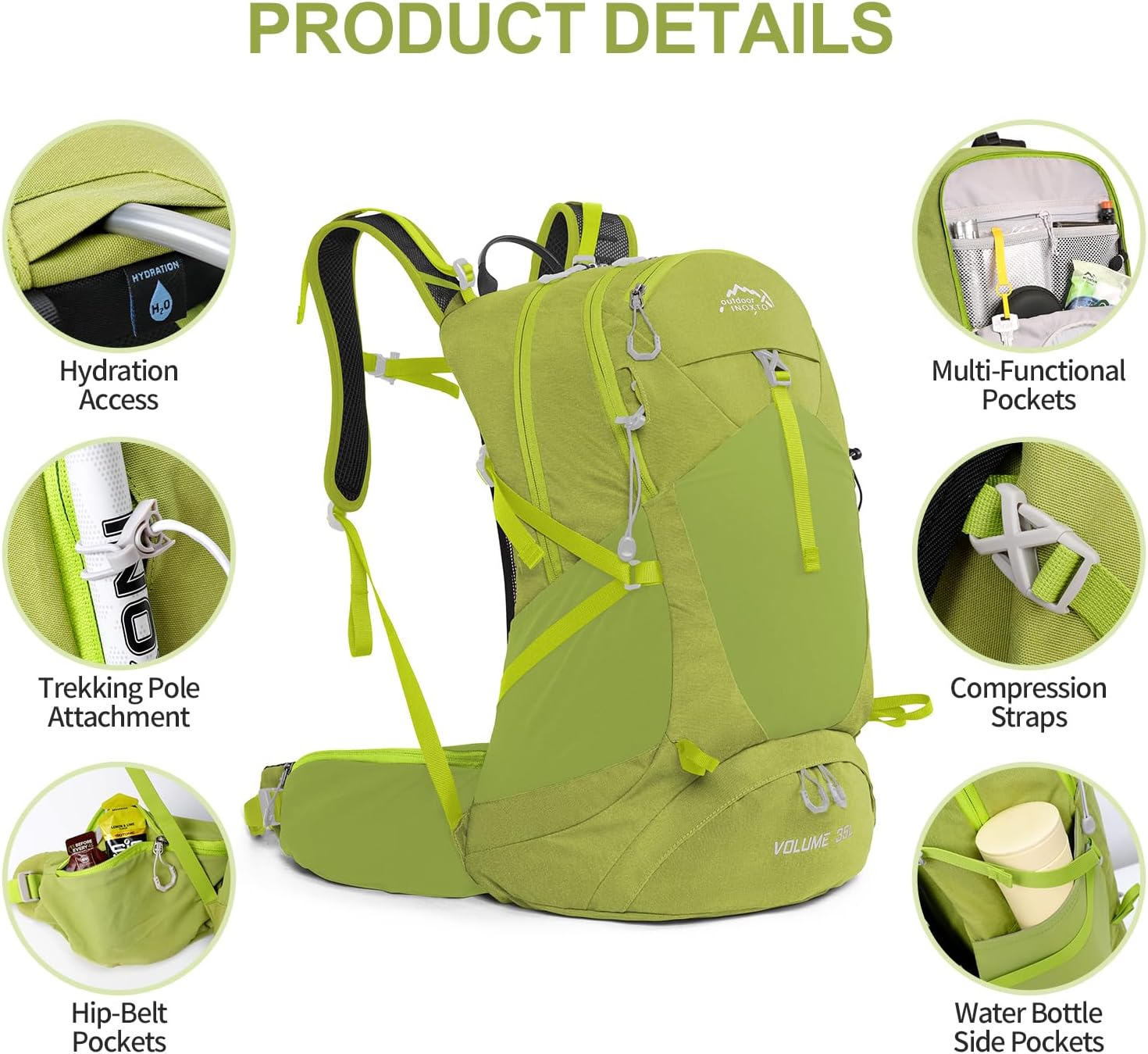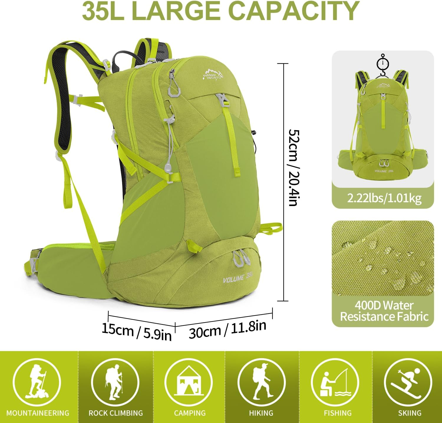 This hiking backpack is a game-changer! The 35L capacity is perfect for day trips, and the waterproof material keeps everything dry. Love the included 3L water bladder—super convenient for staying hydrated. The lightweight design doesn’t strain my shoulders, and the fruit green color adds a fun pop. The rain cover is a nice bonus for unexpected weather. Super comfy and well-organized—great for men and women!