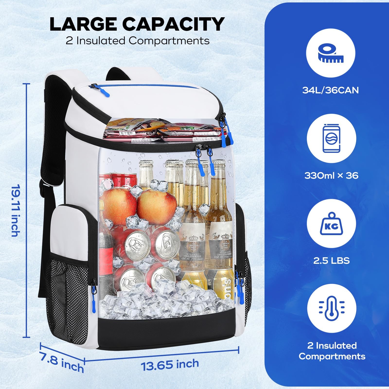 Leakproof and Insulated: Our backpack cooler utilizes advanced seamless hot pressing technology to ensure leak-proof performance. The insulated material effectively preserves the freshness of your food and drinks, keeping them cold for up to 16 hours. Spacious and Organized: The insulated cooler backpack offers ample storage with multiple compartments, measuring 13.65” x 7.8” x 19.11” (LxWxH) and accommodating 36 cans (34 L). Featuring double insulated compartments, a top zipper pocket, front cutlery storage bag, side pockets, and a hidden back zipper pocket, it ensures convenient and organized storage for all your essentials. Innovative Functional Design: Our soft cooler bag is equipped with a detachable bottle opener, providing convenient access to your drinks at any time and place. Additionally, the front side of the lunch cooler backpack features five webbing holes for hanging keys, camping lights, and other tools, while the shoulder strap includes a stretch cord for securing your sunglasses. Comfortable and Durable: Our lunch backpack is designed for comfort and endurance, featuring a padded back, and adjustable breathable shoulder straps. The adjustable chest buckle of travel cooler ensures stability and weight distribution, while also serving as a survival whistle for emergencies. Perfect for Outdoor Adventures: Our ice chest backpack is designed to keep your food and drinks cold while you enjoy outdoor activities such as hiking, picnics, camping, and beach outings. With its insulated compartments and comfortable design, it’s the ideal companion for all your outdoor escapades, ensuring you stay refreshed and hydrated throughout your adventures.
