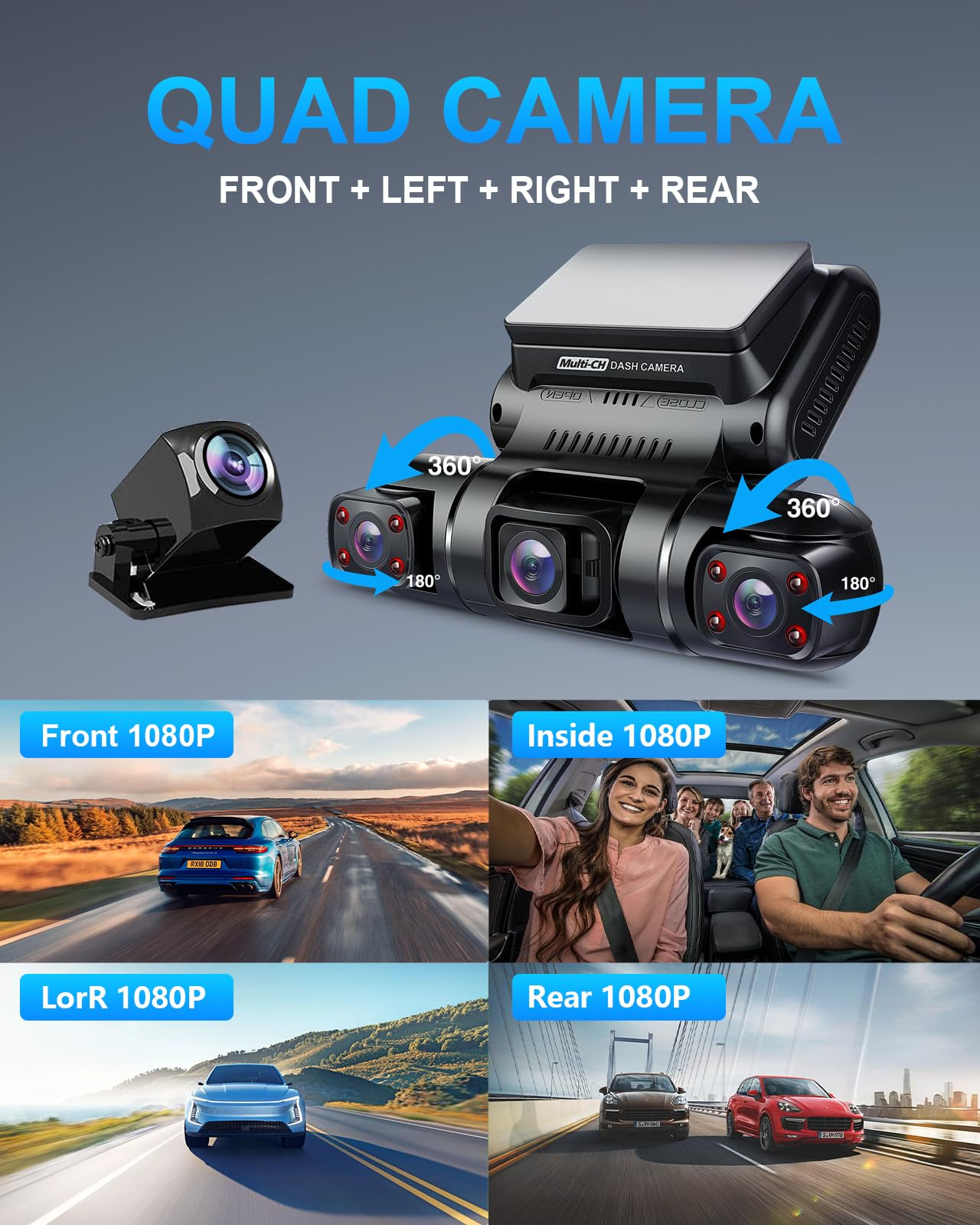[4 Channel Dash Cam, Front Rear Left and Right] The 4-Channel Dash Cam has 4 lenses, all capable of recording FHD 1080P video simultaneously. It can capture the front, rear, left, and right sides of the vehicle simultaneously. The front 3 lenses can adjust the shooting angle so you can capture more details as you like. It can easily cover 360 degrees, ensuring that there is no dead angle around the car. You can use one lens to capture the interior of your vehicle. [Time-lapse Recording & Parking Mode] The dashboard camera's time-lapse function records video at one frame per second and compresses 60-minute video intervals to 1 minute in Parking Mode to save memory card space and enable faster playback. The ACC hardwire kit is required, with a low voltage protection function, it will not drain the car battery. [Built-in GPS Logger] The D90-4CH car dash camera is equipped with a built-in GPS that accurately pinpoints the vehicle's location, speed (in KMH/MPH), time, and routes on a map in real-time. By installing and using the GPS Video Player, the vehicle's path can be visually tracked, while the coordinates ensure that the exact location of any incident is recorded. This is critical for roadside assistance and insurance claims. [Built-in Wi-Fi Capability] Use our free mobile app to set up your dash cam and instantly share your captured videos on your compatible smartphone, available for both iOS and Android devices. You can download videos directly to your phone and share them with friends and family on any social media platform. [Quality Night Vision] The cabin lens has an F1.8 aperture and four infrared lights. This provides round-the-clock protection. This ensures clear recording and superior image performance compared to other dash cams, especially at night. [Loop Recording & Crash Lock] To ensure endless loop recording, the dash cam automatically deletes the oldest unlocked footage when the memory card reaches its maximum capacity. In case of a collision, the dash cam will automatically lock the currently recorded footage as evidence. Locked files will not be overwritten by loop recording. [Easy Installation & No Battery] Installation and use are made easy with the reference images provided in our user manual. The dash cam does not include a battery to prevent damage from sun exposure, high temperatures inside the car, or battery malfunction.