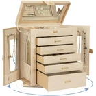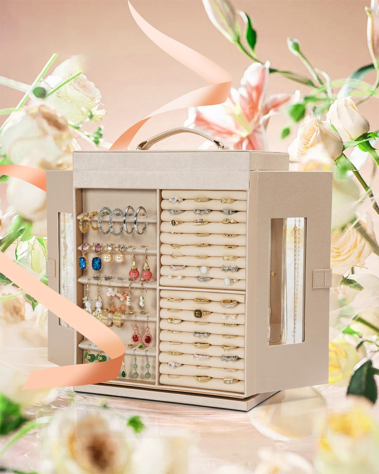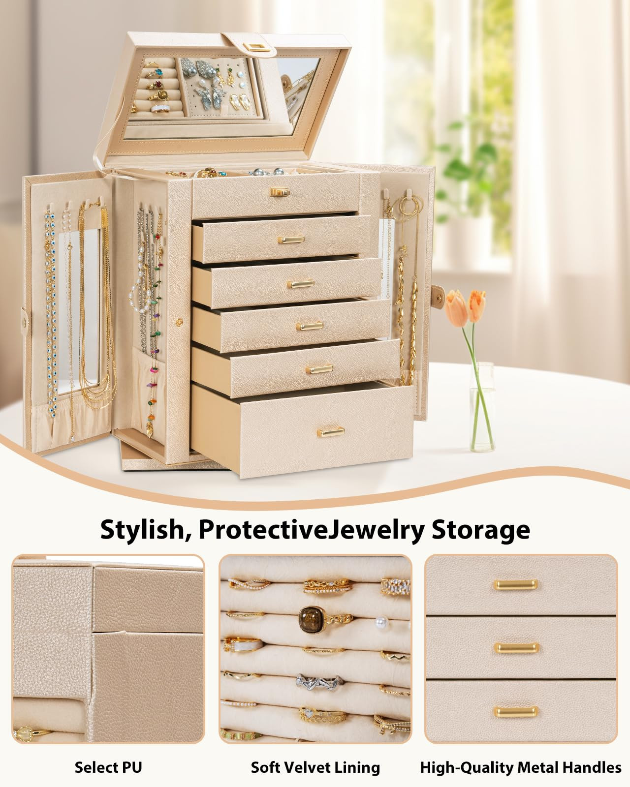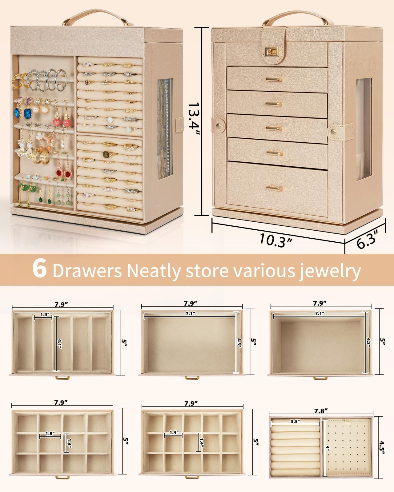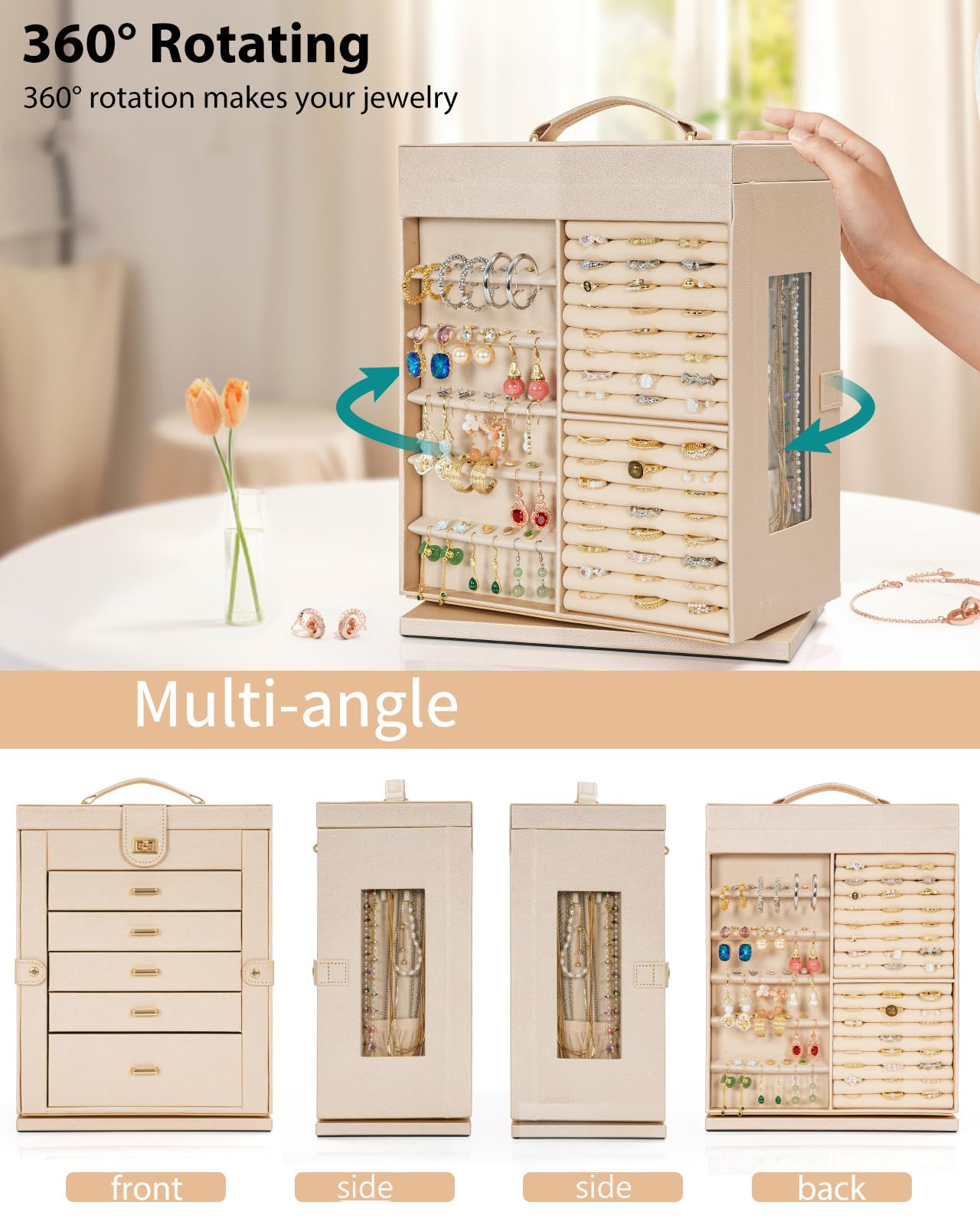 Jewelry Box 360° Rotating 6-Tier Functional Jewelry Storage Case Organizer for Women Girls Ring Necklace Earring Bracelet Holder with Mirror Large Capacity, More Storage Space, With 6 versatile pull out drawers, and additional ring and earring storage at the back,this black huge jewelry box can store a lot of jewelry accessories, such as rings, earrings, necklaces, chains, bracelets and so on. One deeper drawer is designed for watches,sunglasses or large jewelries 360°Rotating Elegant, Attractive appearance with leather surface and soft velvet lining. Sturdy construction and quality material make it very durable.Plus 360° rotation function,The jewelry holder can tidy your table and protect your precious jewelry for a very long time Large Mirror Handle, This jewelry box comes with a built-in large mirror on top lid, making it easier to dress yourself. The lid has a ribbon attached to keep it from falling back. With a grab-and-go handle, convenient to move it; delicate buckle for one-hand easy opening, easy to use and saving your time at home 6 Layers with 5 Versatile Pull Out Drawers 2 Side Cabinets, Drawer 1 has 20 equal size slots; Drawer 2 has 12 equal size slots; Drawer 3 has 4 equal size slots.The two deeper bottoms of the 5 removable drawers has only one compartment;The 2 swing out Cabinets including 8 hooks and 2 pockets, help to keep your necklaces from getting tangled Nice Present, Jewelry Organizer is nice choice for Valentine's Day, Mother's Day, Thanksgiving Day, Birthday and Wedding. Suit for Mother, Girlfriend, Wife, Daughter and So On